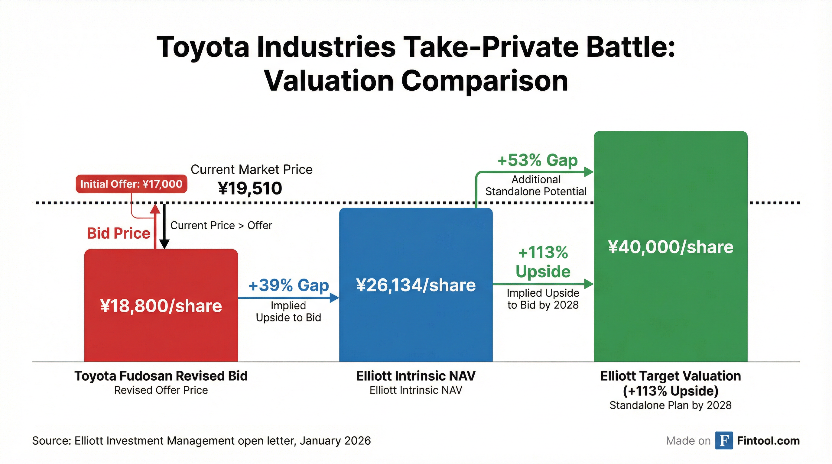 The revised ¥18,800 offer represents only a ¥200 increase from a price that Toyota Industries' own board previously said "deviated significantly from its expectations." Elliott notes this cosmetic bump came despite Toyota Motor's share price rising 7.5% on January 13, 2026—the day after the final revised offer was submitted—adding ¥1,005 per share to Toyota Industries' intrinsic value.