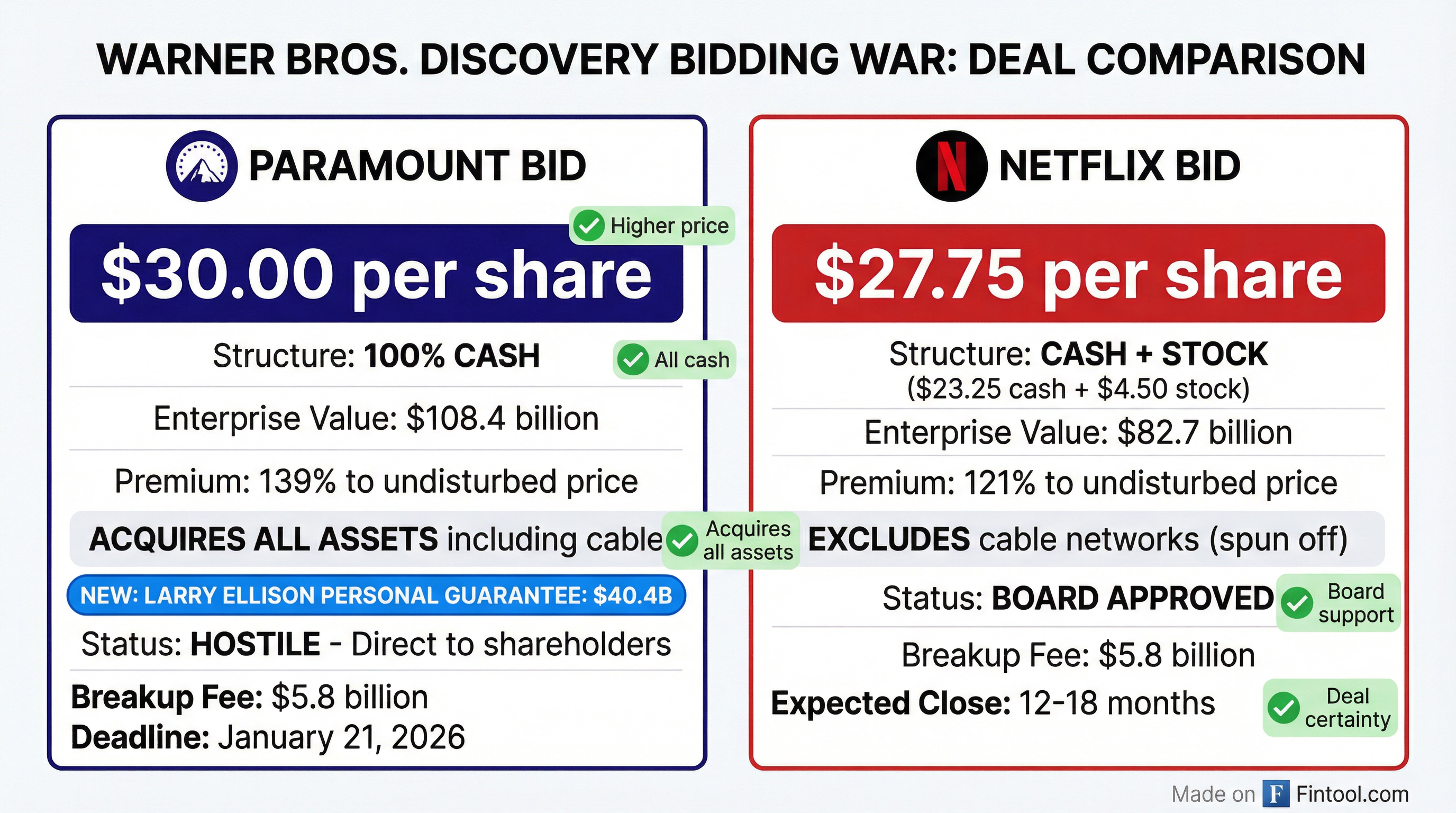 The guarantee transforms the bidding war for Hollywood's most prized asset. When WBD's board rejected Paramount's offer on December 17, it cited "significant risks" around financing, specifically questioning whether the Ellison family trust—which held the equity backstop—could be revoked or altered.
