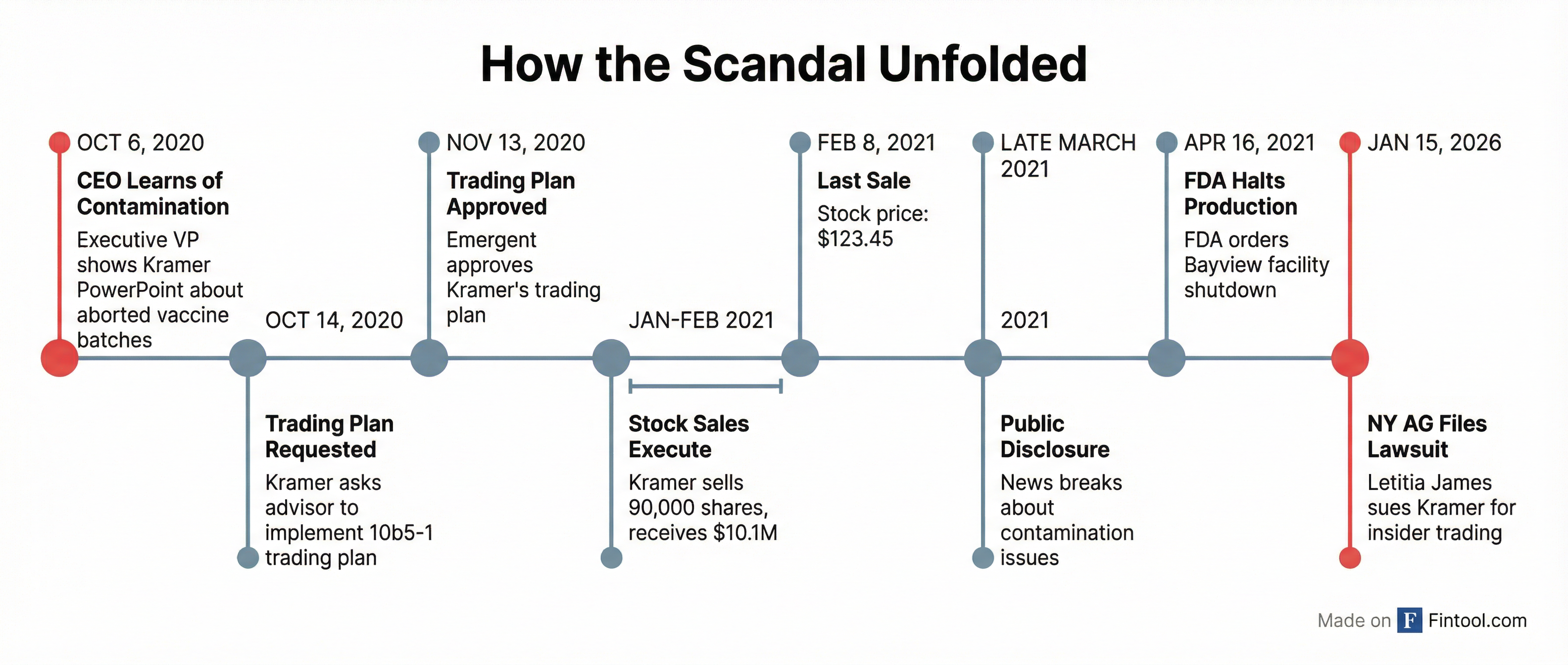 Kramer's final sale occurred on February 8, 2021, when Emergent's stock closed at $123.45—just weeks before analysts began publicly questioning the Baltimore plant's slow production and months before the full scope of the contamination crisis became public knowledge.