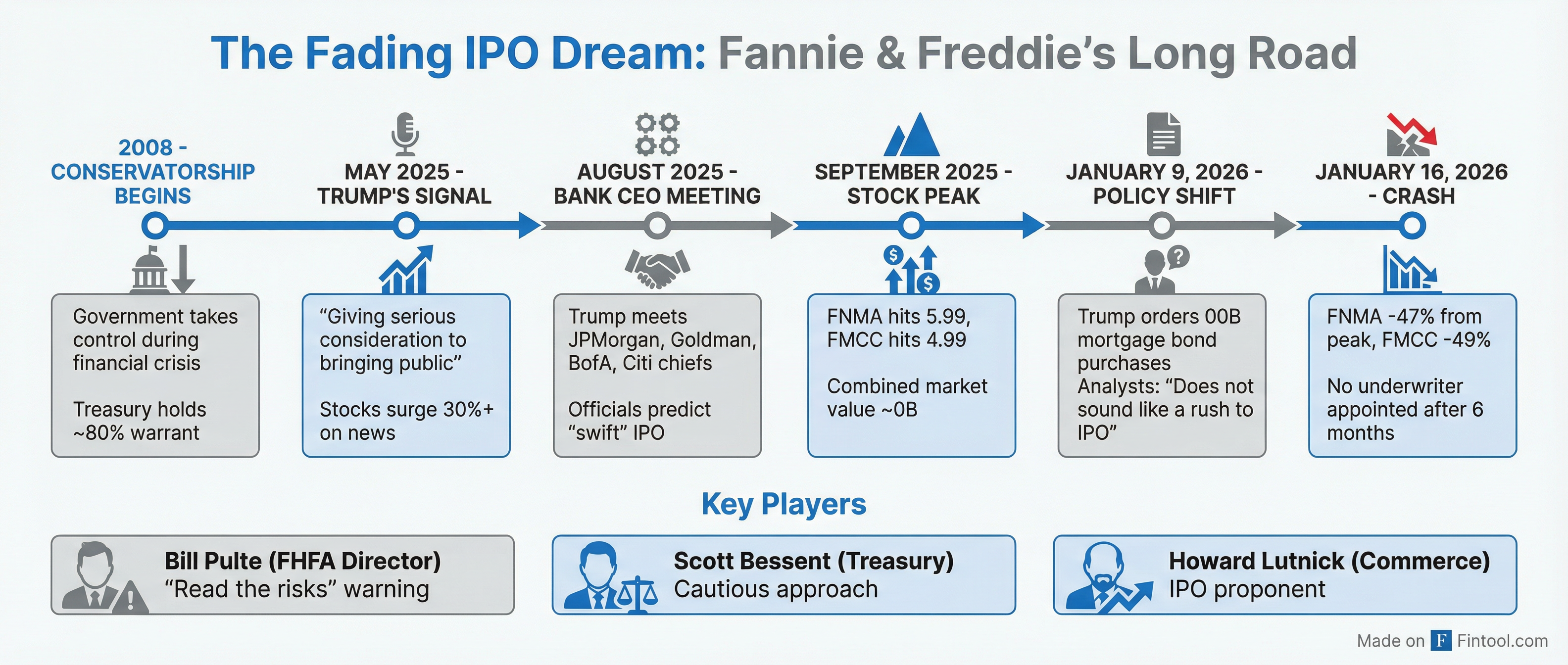 The immediate catalyst is Trump's pending decision on the IPO path—FHFA's Pulte told CNBC on January 8 that Trump would decide "in the next month or two."