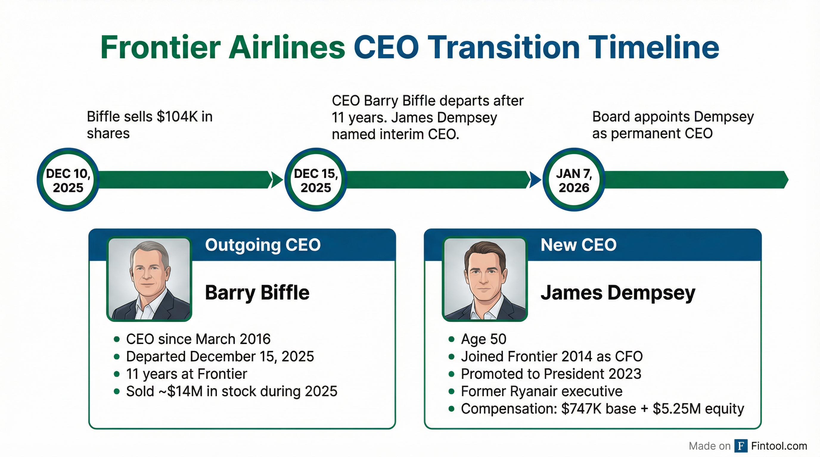 Frontier's December 15 announcement was terse: Biffle was out, effective immediately, and would stay on as an advisor through year-end. The 8-K filing stated his departure was "not the result of any disagreement with the Company on any matter relating to the Company's operations, policies or practices."