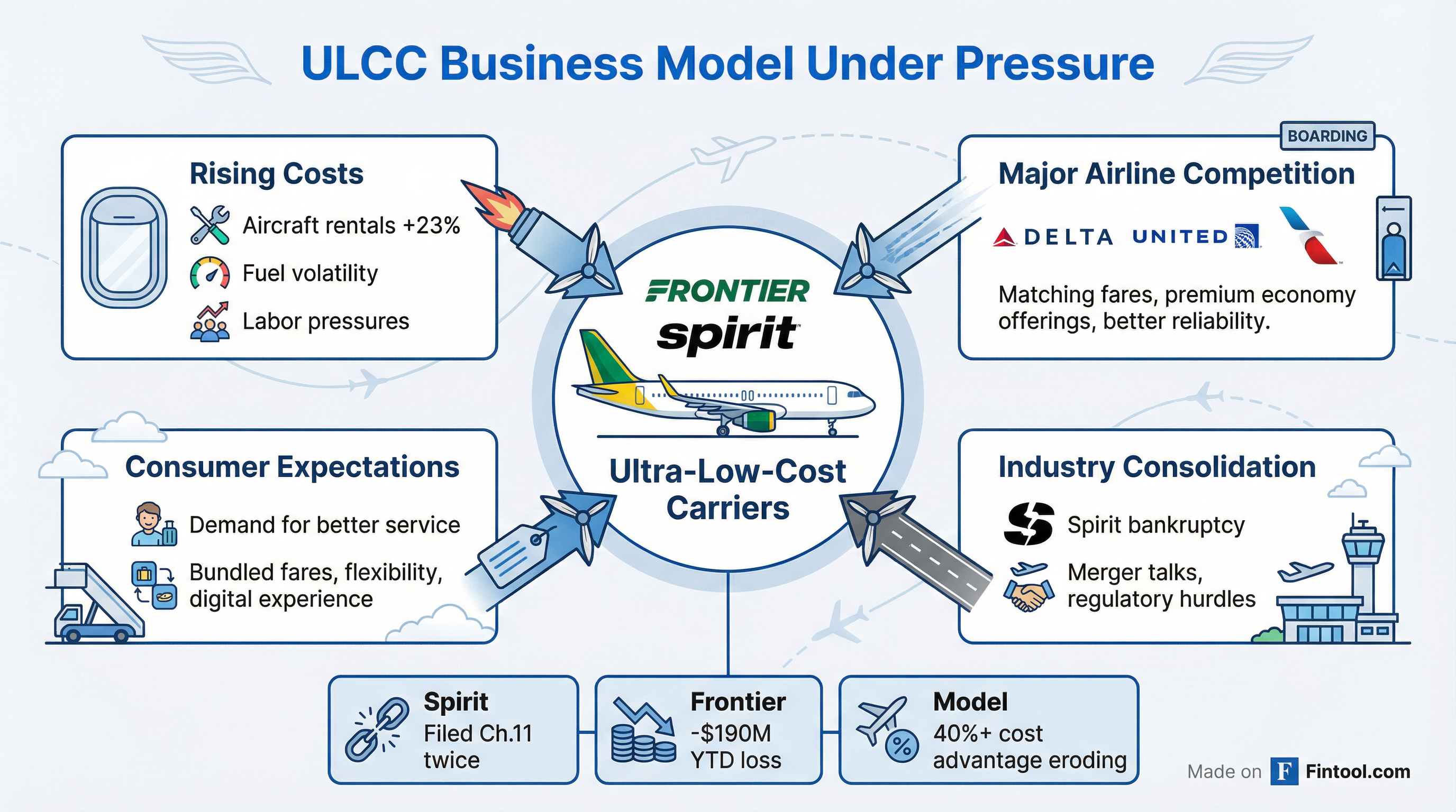 Frontier's struggles aren't isolated. The entire ultra-low-cost carrier business model faces an existential test. Spirit Airlines has filed for bankruptcy protection twice in less than 12 months. The major carriers—Delta-1.77%, United-1.73%, and American+0.06%—have learned to match discount fares selectively while leveraging loyalty programs and premium cabins to defend market share.