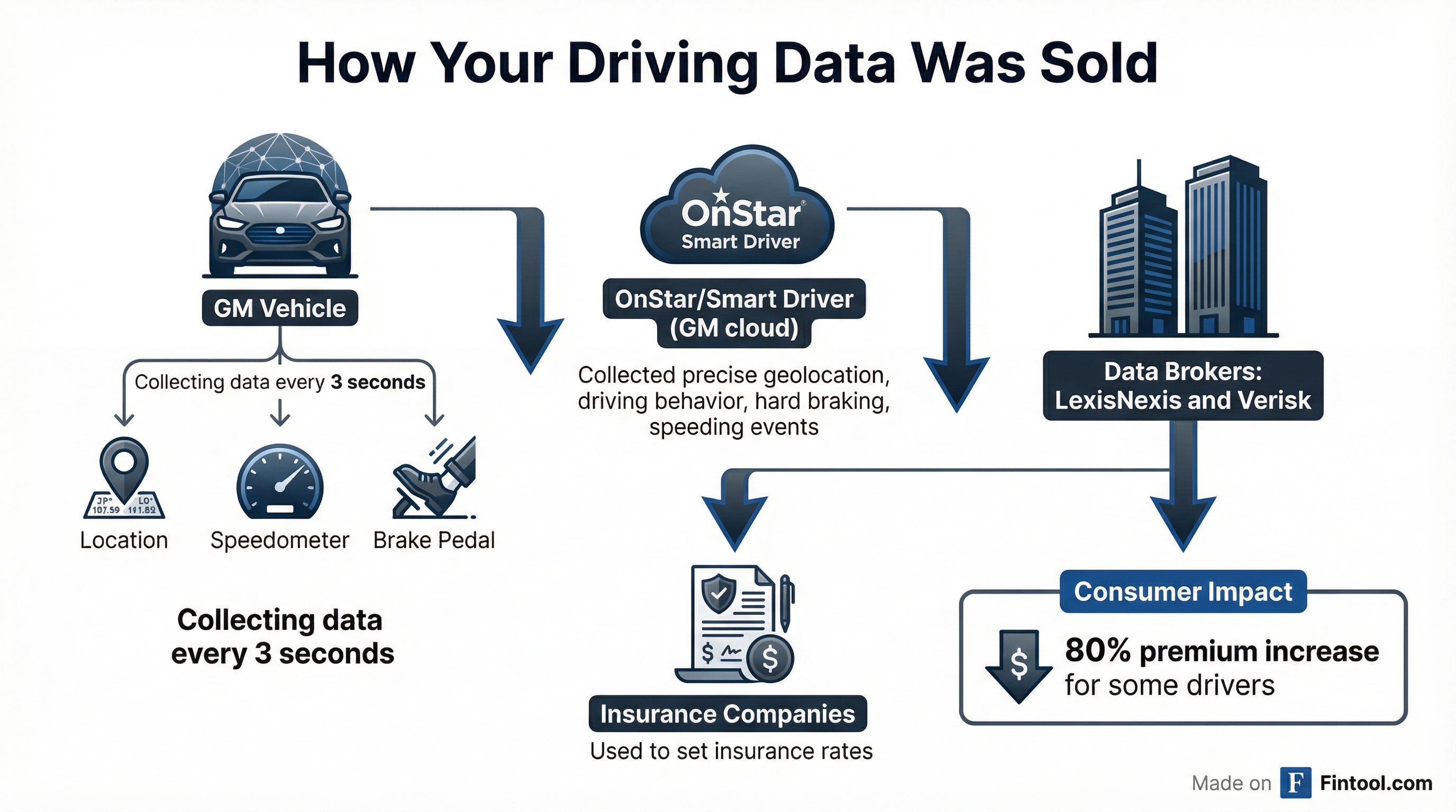 The scheme worked like this: GM's OnStar Smart Driver feature, pitched as a free add-on to encourage safer driving, quietly collected precise location data, hard braking events, speeding incidents, and other driving behaviors. This information was transmitted to GM as often as every three seconds, then sold to data brokers LexisNexis (owned by Relx-0.12%) and Verisk Analytics-1.10%.