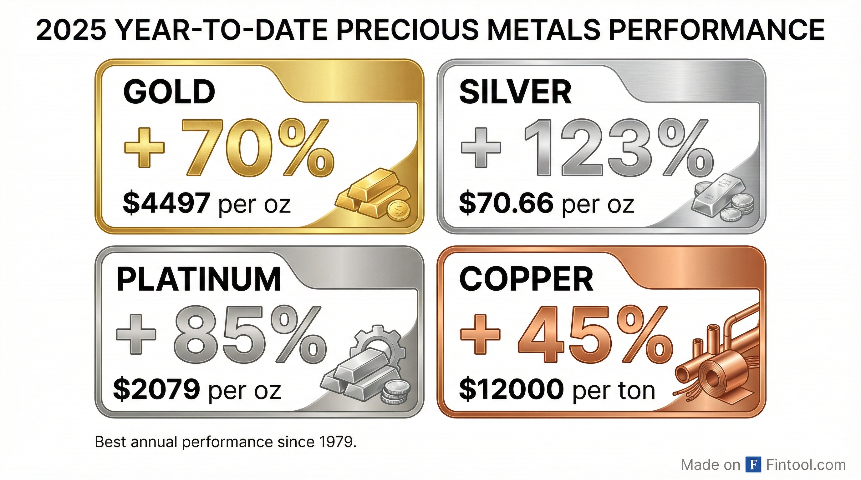 | Gold | $4,449/oz | +70% | $4,497.55 | Best year since 1979 |