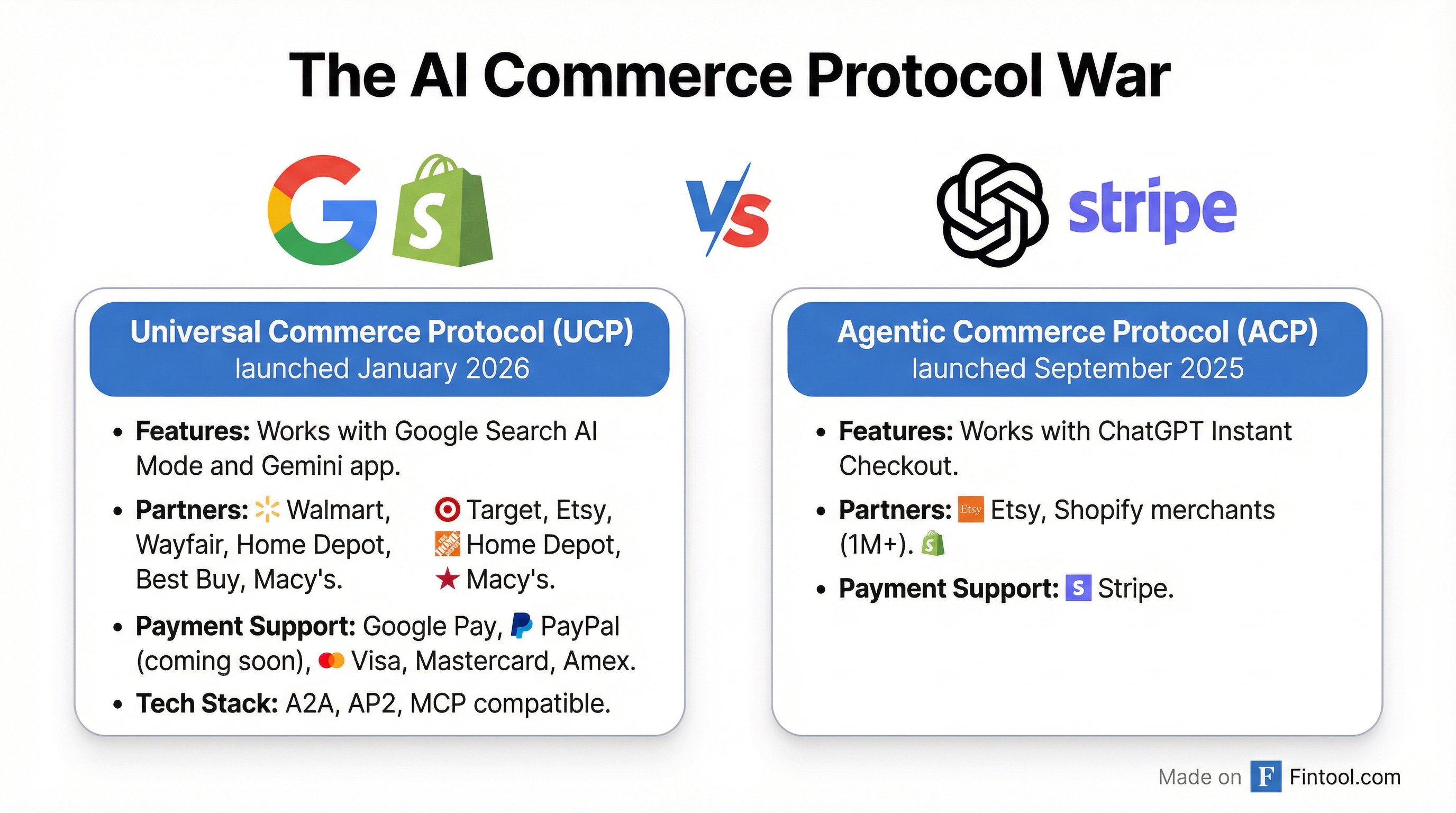 The UCP launch escalates the competition with OpenAI, which introduced its own Agentic Commerce Protocol (ACP) in September 2025, powering ChatGPT's "Instant Checkout" feature. That protocol, developed with Stripe, currently supports Etsy and over a million Shopify merchants.