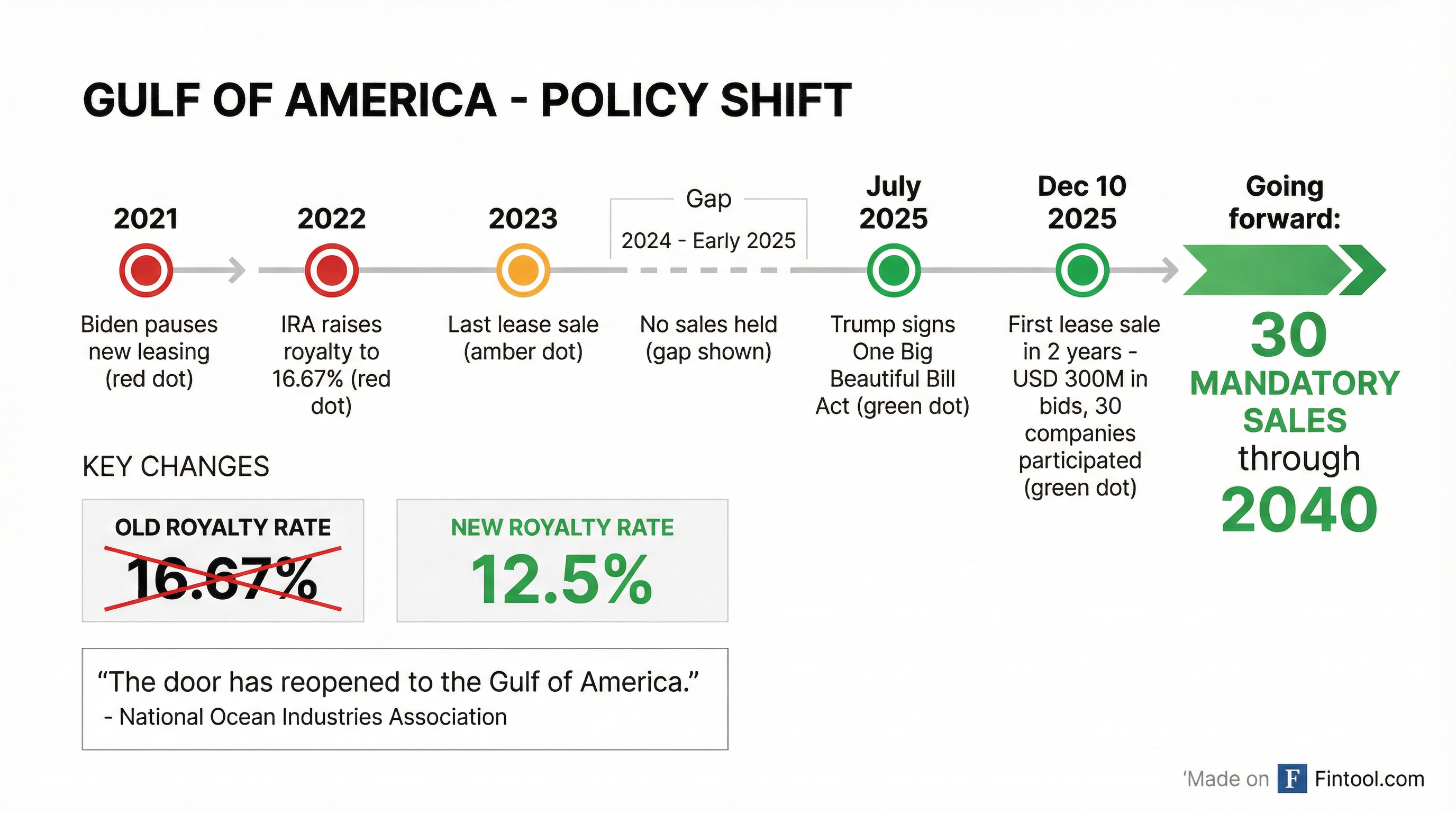Mandatory lease sales: The OBBB mandates 30 oil and gas lease sales in the Gulf of America through 2040, providing regulatory certainty that was absent under the Biden administration's historically restrictive five-year plan.