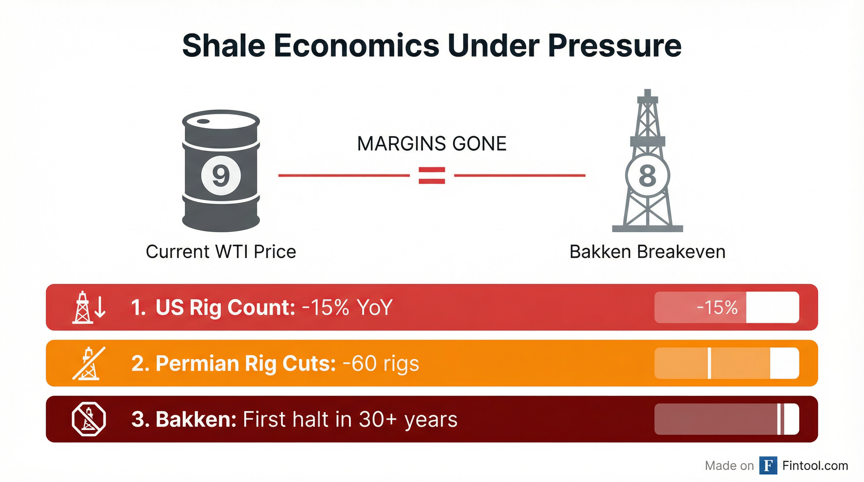 Rig Count Collapse: The number of rigs drilling across the US has dropped by 15% over the past year. The Permian Basin alone has seen 60 rigs cut—the largest reduction in the country's most prolific crude region.