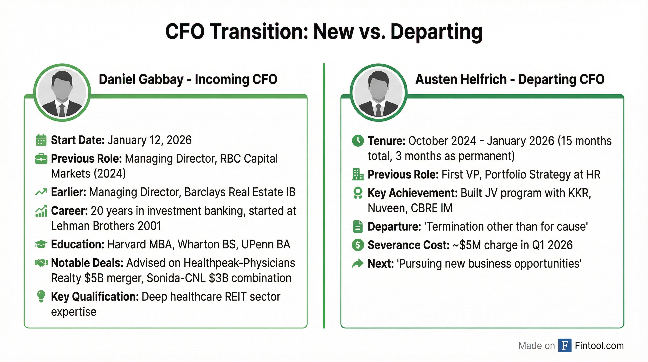 The transition carries a $5 million severance charge and represents the second CFO departure in 15 months at the nation's largest pure-play medical outpatient REIT.
