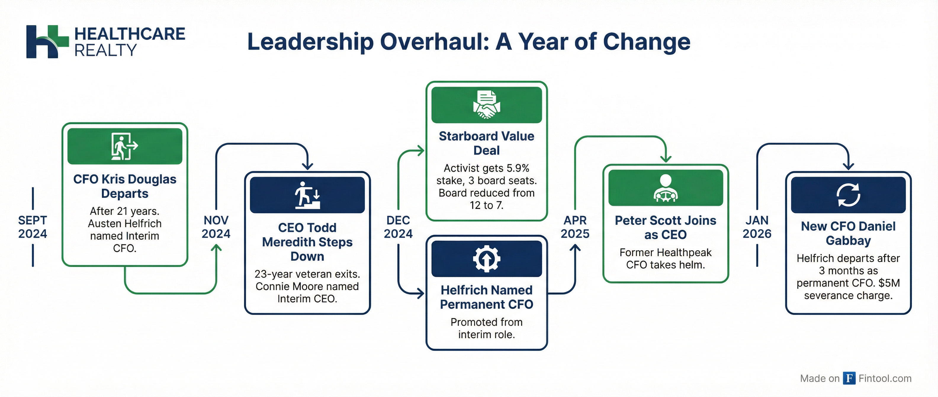 The Scott-Gabbay pairing represents a deliberate strategy to import the Healthpeak playbook to Healthcare Realty. Scott's track record at Healthpeak included the Physicians Realty merger, $12 billion in asset recycling, and reducing leverage by roughly two turns.