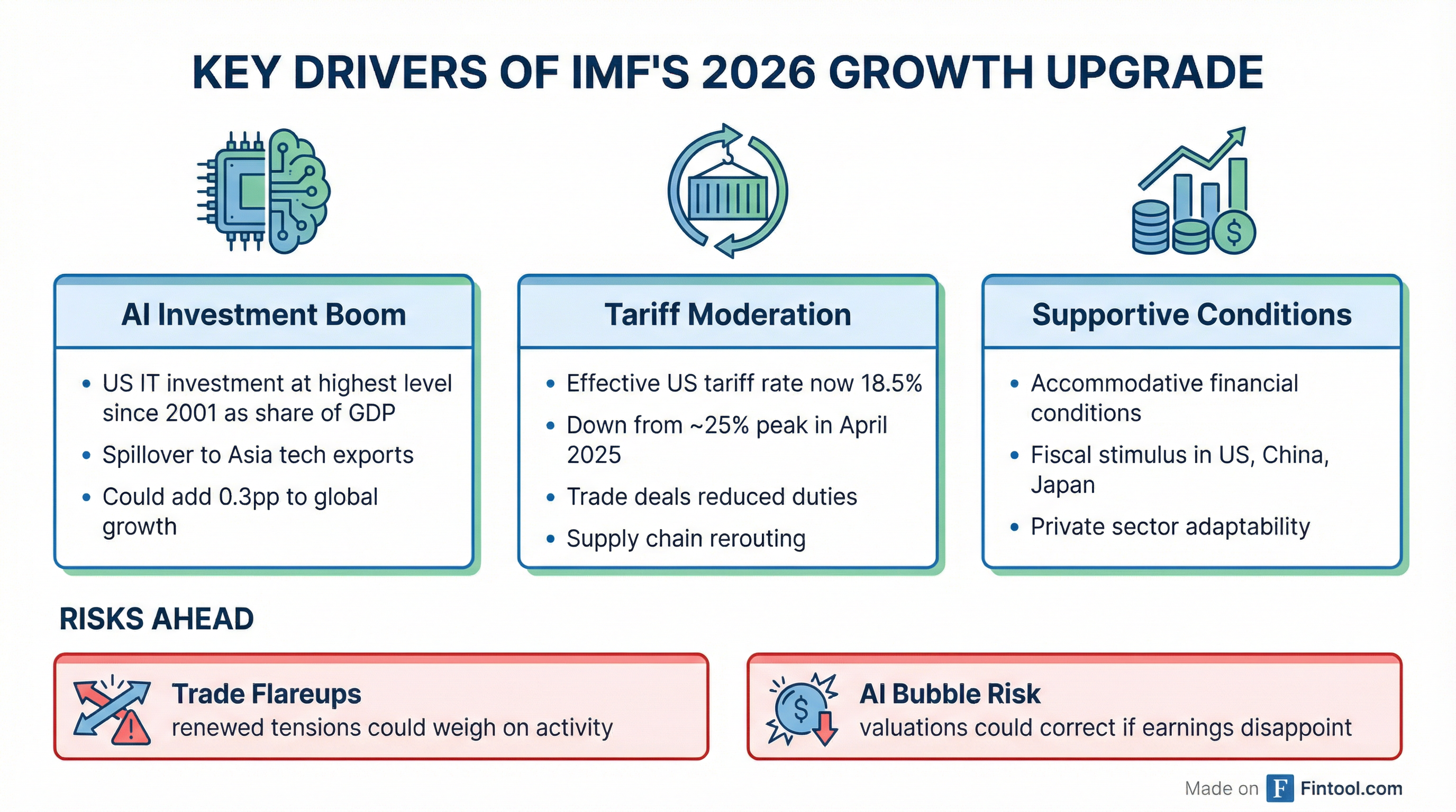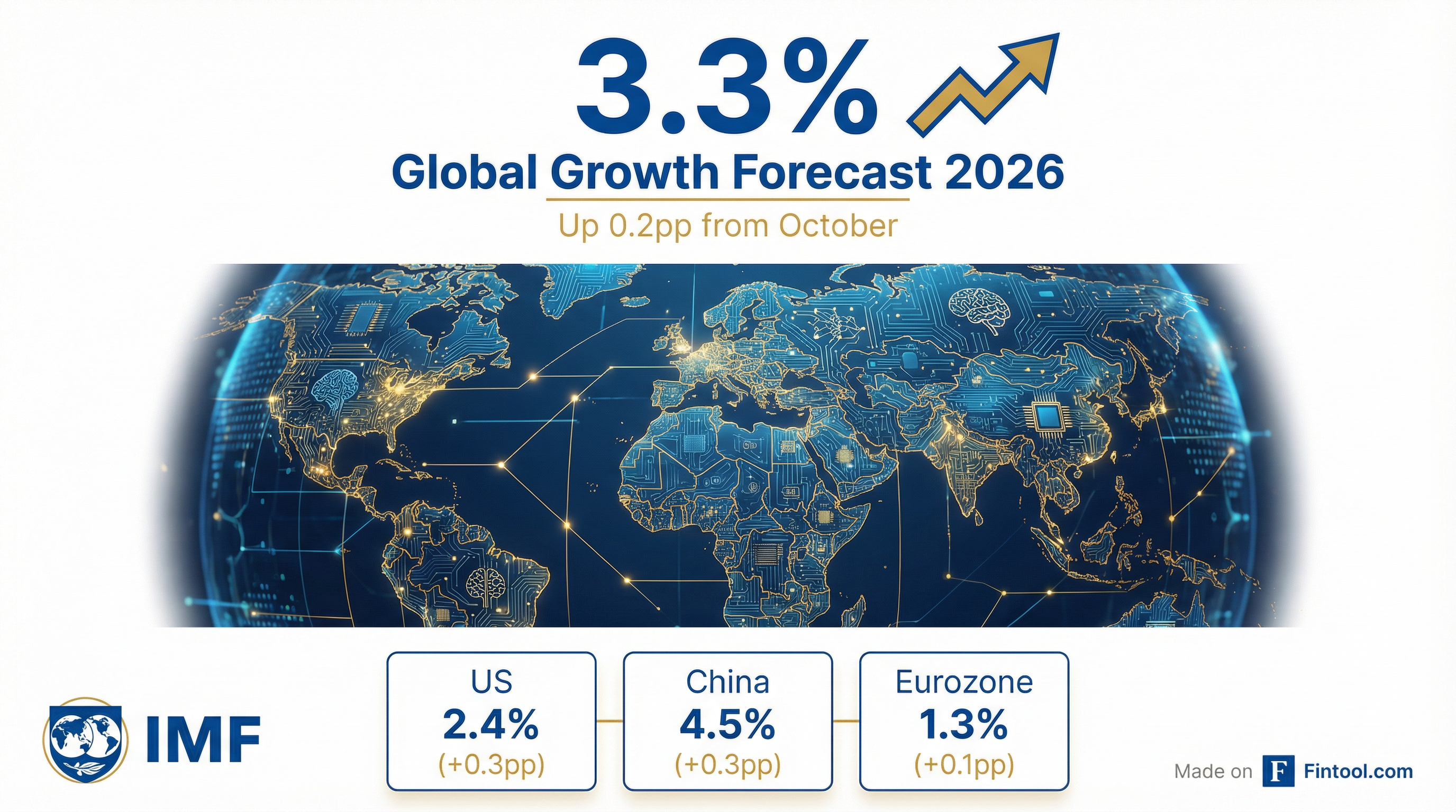 The International Monetary Fund raised its 2026 global growth forecast to 3.3%—up 0.2 percentage points from October—as a historic surge in artificial intelligence investment offsets the drag from trade disruptions. The upgrade marks a striking turnaround: just one year ago, economists feared President Trump's tariff regime would derail the global expansion. Instead, the Fund now says the world economy is "shaking off the tariff shock."