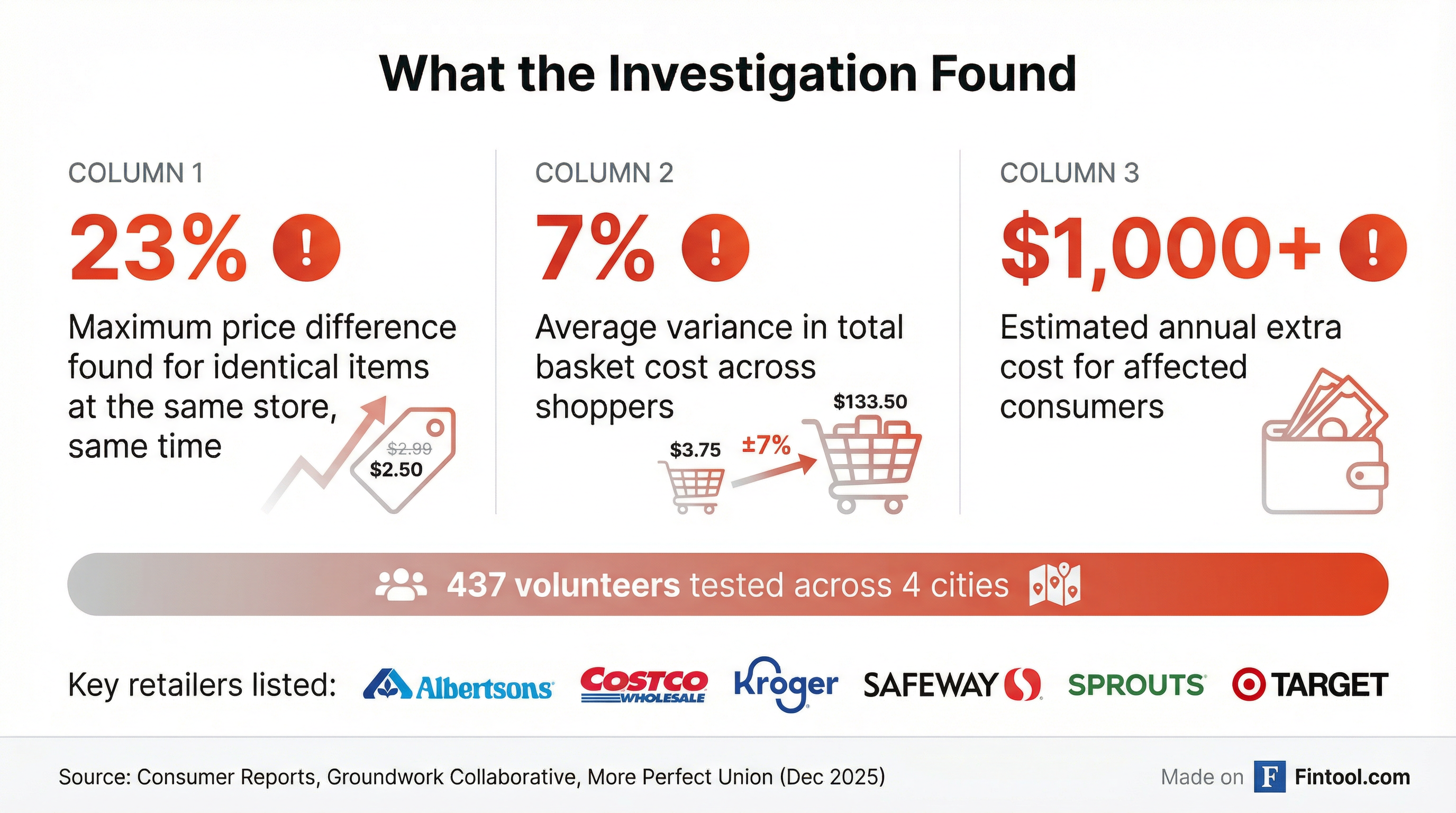 The pricing experiments extended across major retailers including Albertsons-0.46%, Costco-0.38%, Kroger-0.33%, Safeway, Sprouts Farmers Market, and Target.