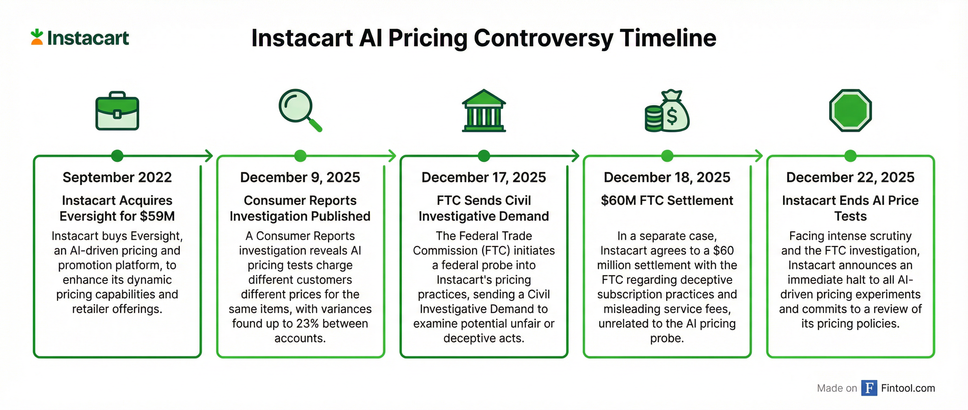 The investigation came days after Instacart agreed to a separate $60 million settlement with the FTC over deceptive subscription practices and misleading "satisfaction guarantee" advertising—a one-two regulatory punch that left the company with little choice but to capitulate on the pricing experiments.