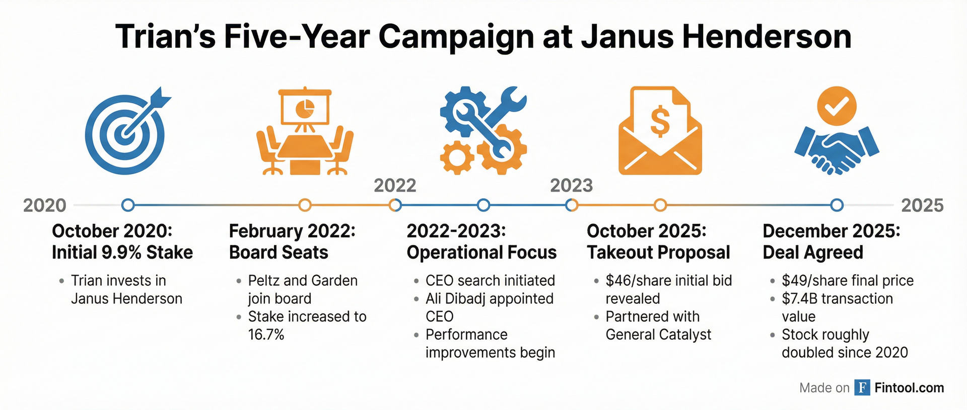 The campaign began in October 2020 when Trian took a 9.9% stake in both Janus Henderson and Invesco, signaling its interest in the asset management sector. While Trian exited Invesco in February 2022 after that company's "financial performance had significantly improved," Janus Henderson proved a longer project.