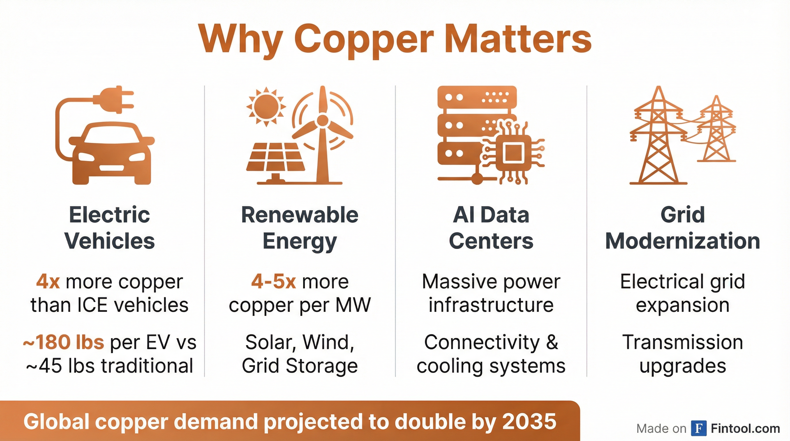 - Electric vehicles, which use 4x more copper than traditional internal combustion vehicles