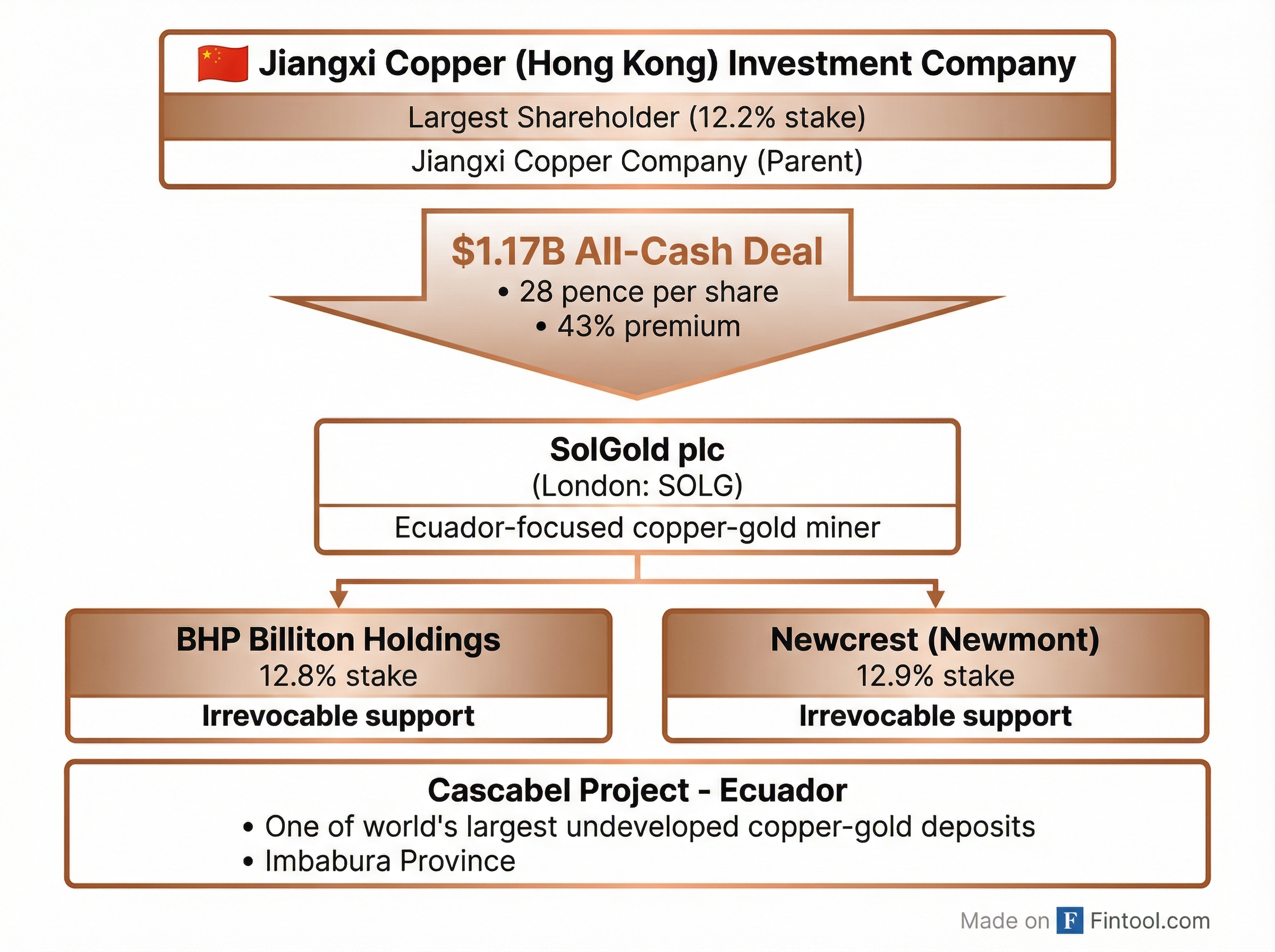 Jiangxi Copper (Hong Kong) Investment Company Limited, which already held a 12.2% stake in SolGold, secured irrevocable undertakings from the company's second and third-largest shareholders—BHP-0.90% Billiton Holdings (12.8%) and Newcrest International Pty Ltd, a subsidiary of Newmont-1.97% (12.9%). Together with board support, this brings backing for the deal to approximately 28.5% of shares outstanding.