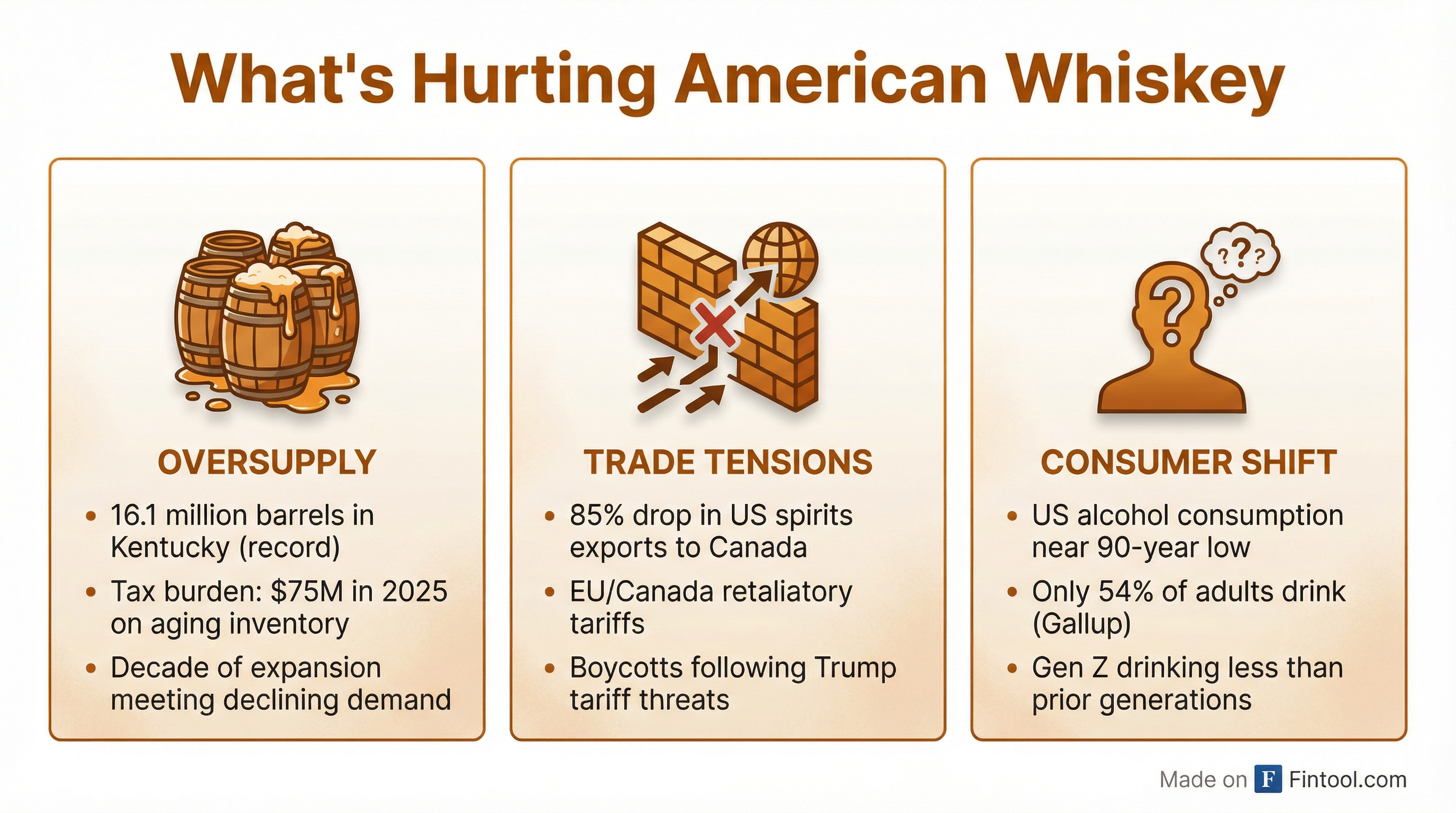 Oversupply from the boom years. For nearly two decades, distillers expanded aggressively to meet surging demand. They invested billions in new capacity, put away millions of barrels to age, and flooded the market with new products. Today, Kentucky warehouses hold a record 16.1 million barrels—and bourbon takes years to age before it's ready to sell.