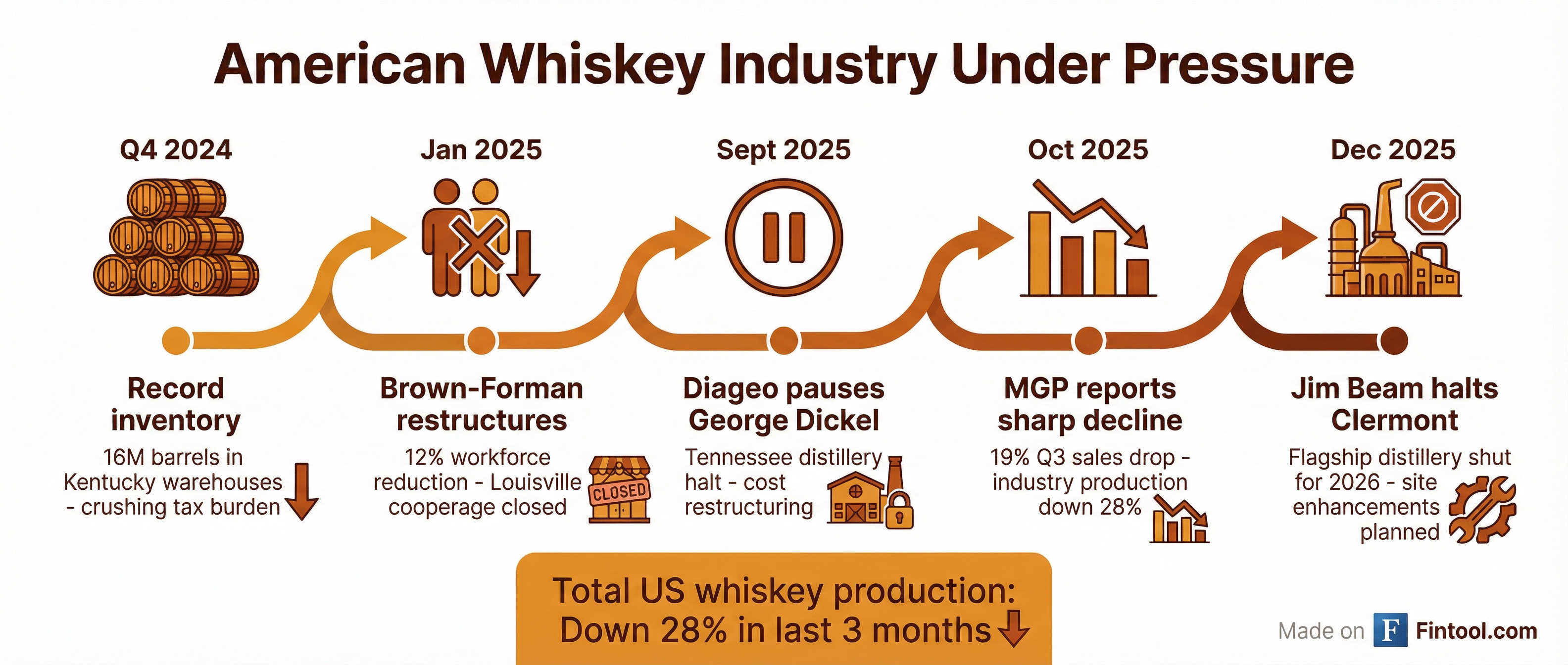 - October 2025: MGP Ingredients reports 19% Q3 sales decline; industry production down 28%
