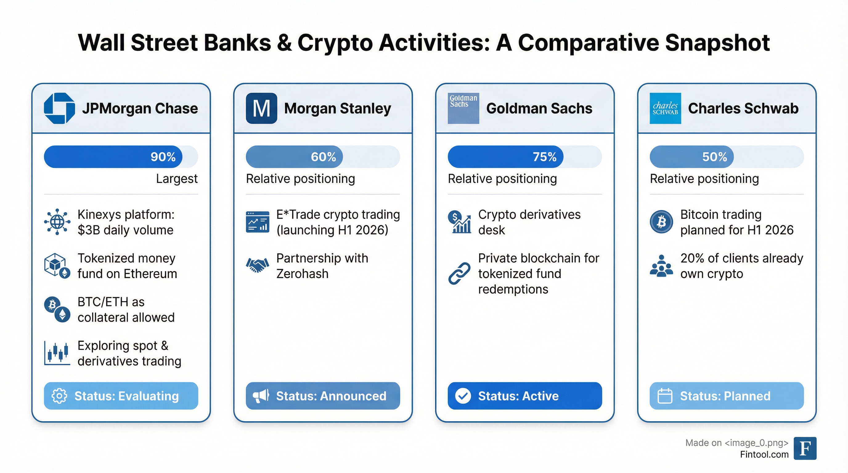The bank is assessing spot and derivatives trading products within its markets division, though discussions remain in early stages with no formal commitment to launch . The potential move would position JPMorgan alongside Morgan Stanley-0.87%, Goldman Sachs-0.61%, and Charles Schwab in a coordinated Wall Street embrace of digital assets following Trump administration regulatory shifts.