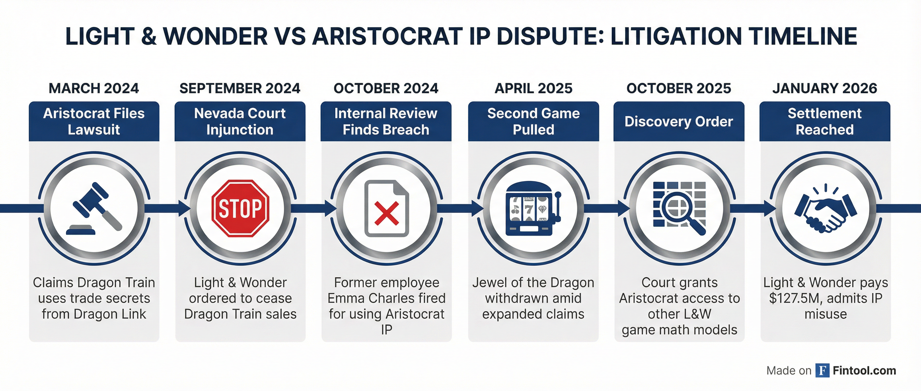 April 2025: Aristocrat expanded its claims to include Jewel of the Dragon, prompting Light & Wonder to voluntarily withdraw that game as well .