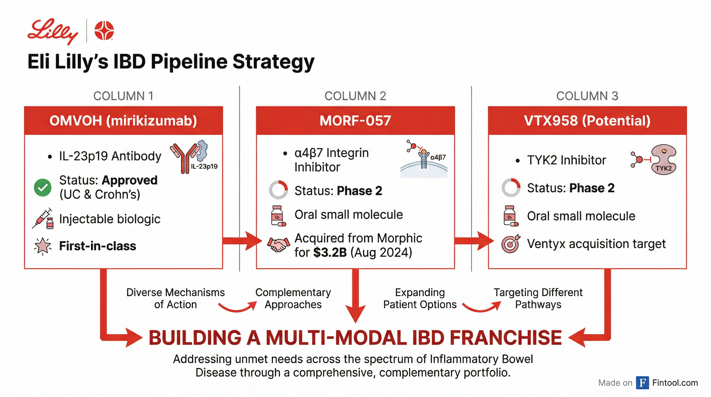 If this deal closes, Lilly will have spent over $5.5 billion in 18 months building what may become the most comprehensive IBD franchise in the industry. The combination of an approved biologic (Omvoh), an oral integrin inhibitor (MORF-057), and potentially an oral TYK2 inhibitor (VTX958) positions Lilly to offer physicians multiple options—and potentially combinations—for patients with treatment-refractory disease.