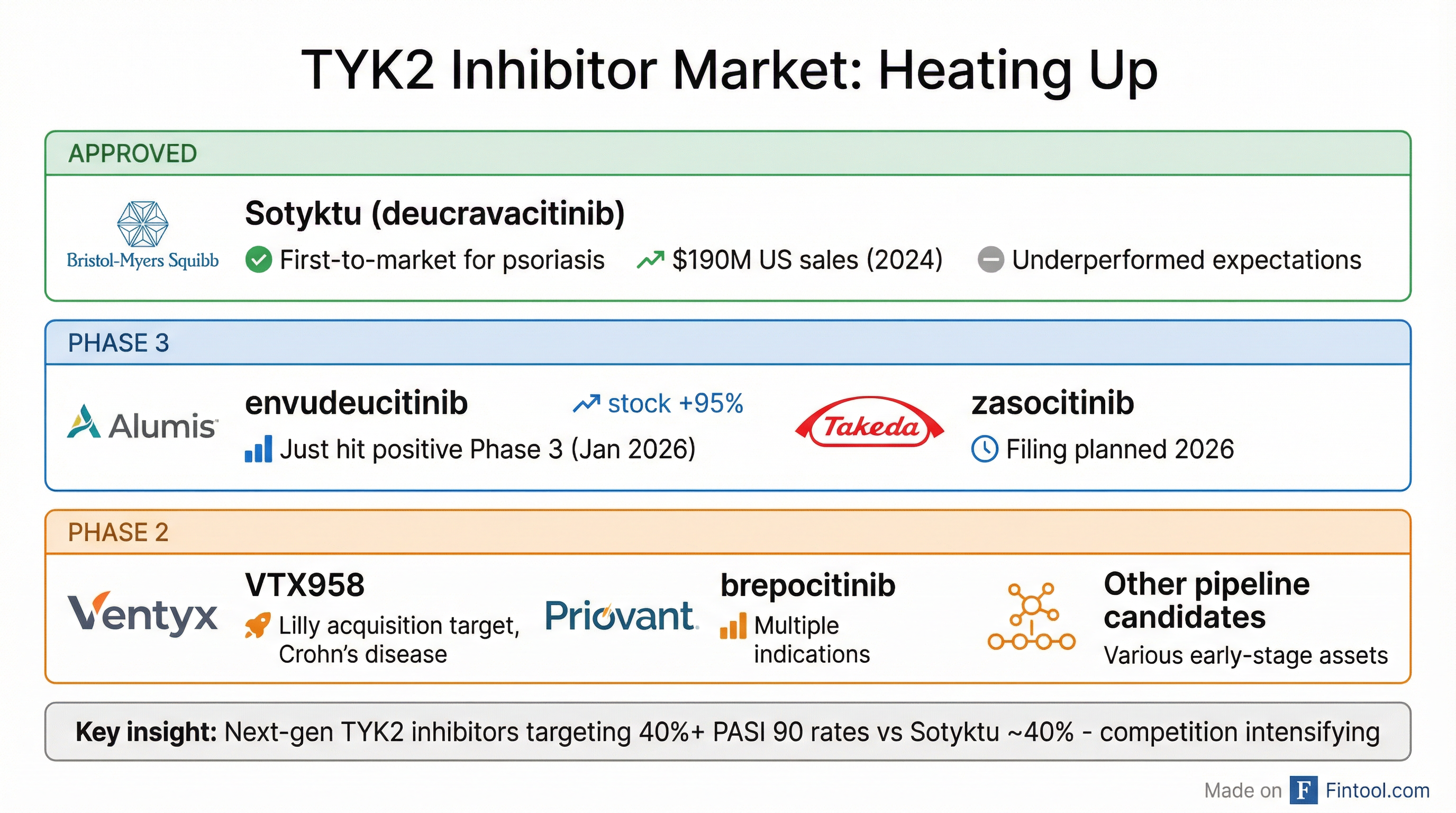 The timing of this deal coincides with a flurry of activity in the TYK2 inhibitor market. Just yesterday, Alumis reported positive Phase 3 data for its TYK2 inhibitor envudeucitinib in psoriasis, sending its shares up 95%. Takeda is also planning regulatory filings for zasocitinib in 2026.