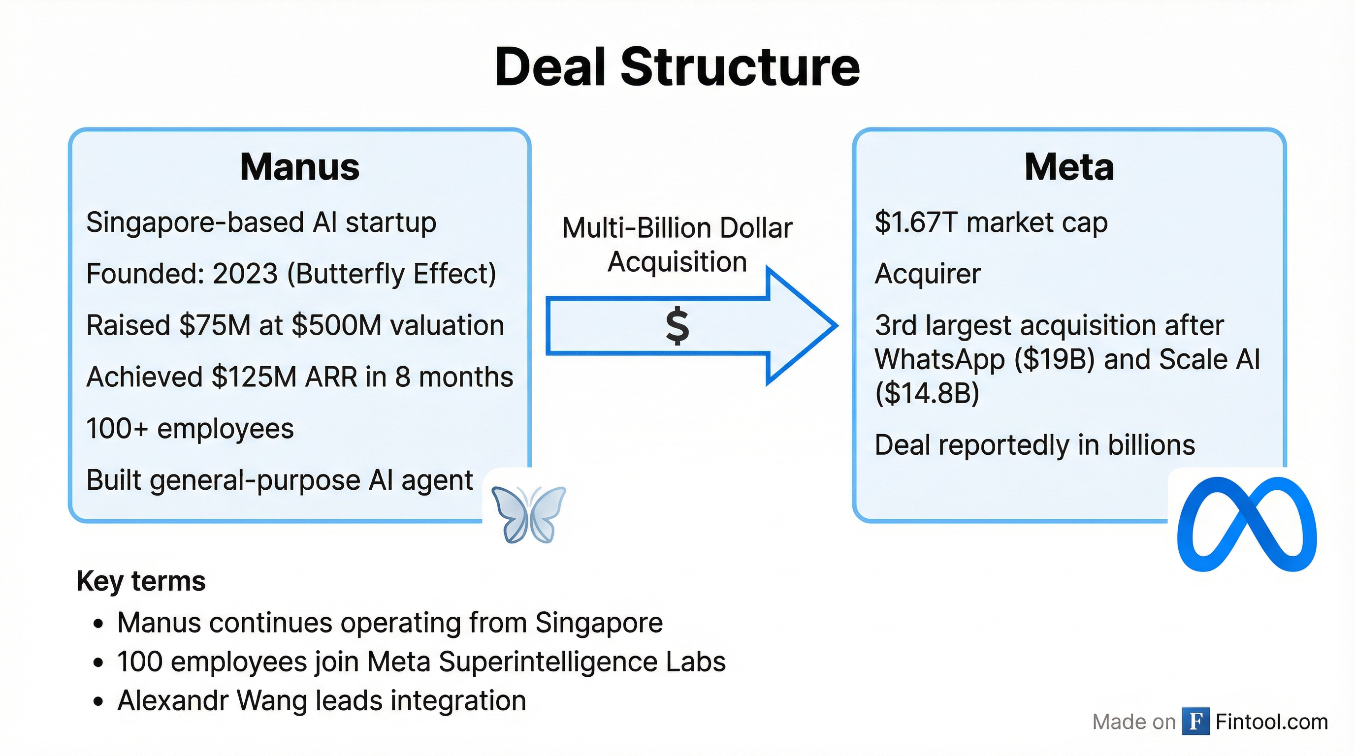 Revenue contribution: Manus's $125M ARR is meaningful but tiny relative to Meta's $180B+ annual revenue run rate. The strategic value lies in accelerating Meta's AI capabilities, not immediate financial impact.