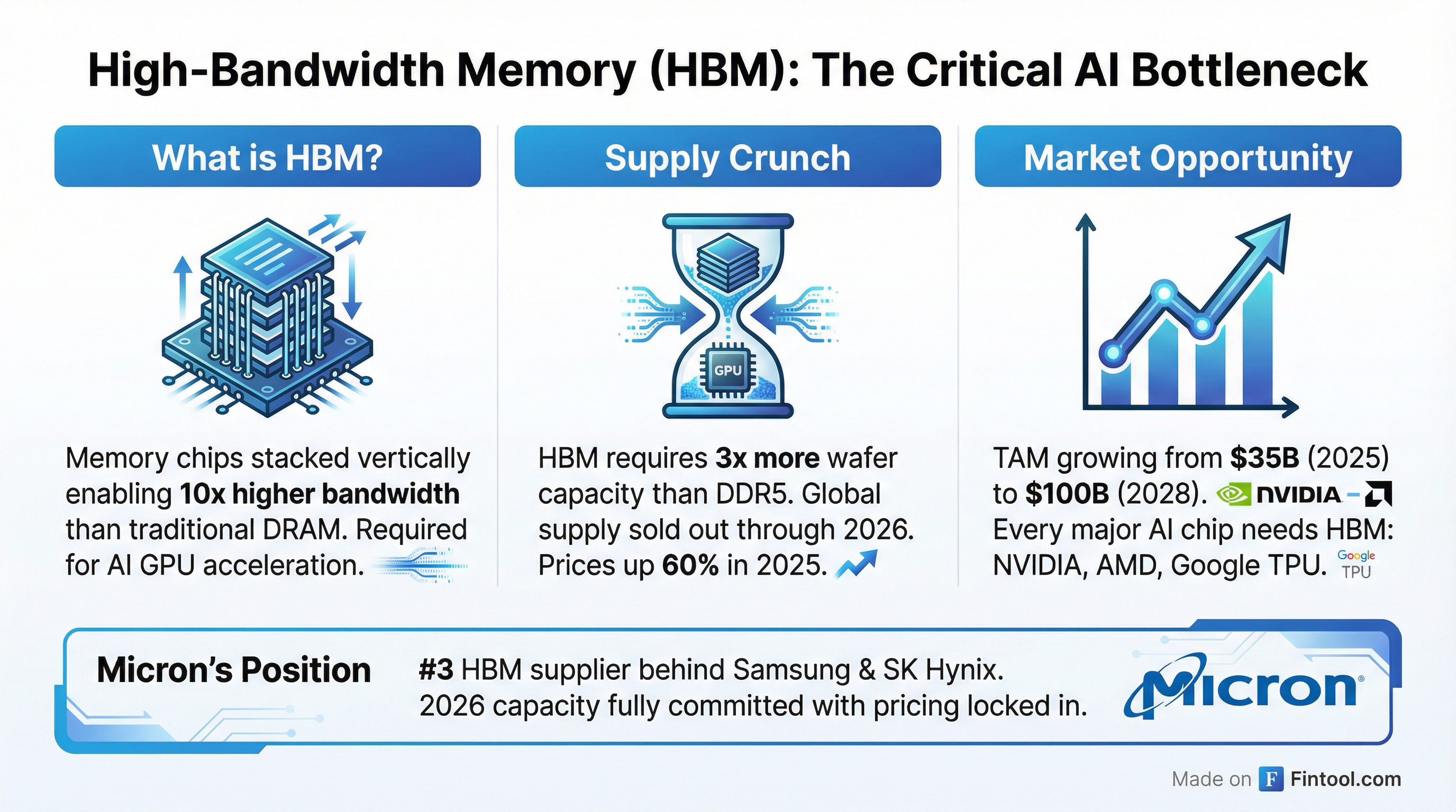 The driver: insatiable demand for high-bandwidth memory (HBM), the specialized chips that power AI accelerators from NVIDIA, Amd+0.91%, and Google. Micron's entire 2026 HBM supply is already sold out, with both volume and pricing locked in through customer agreements.