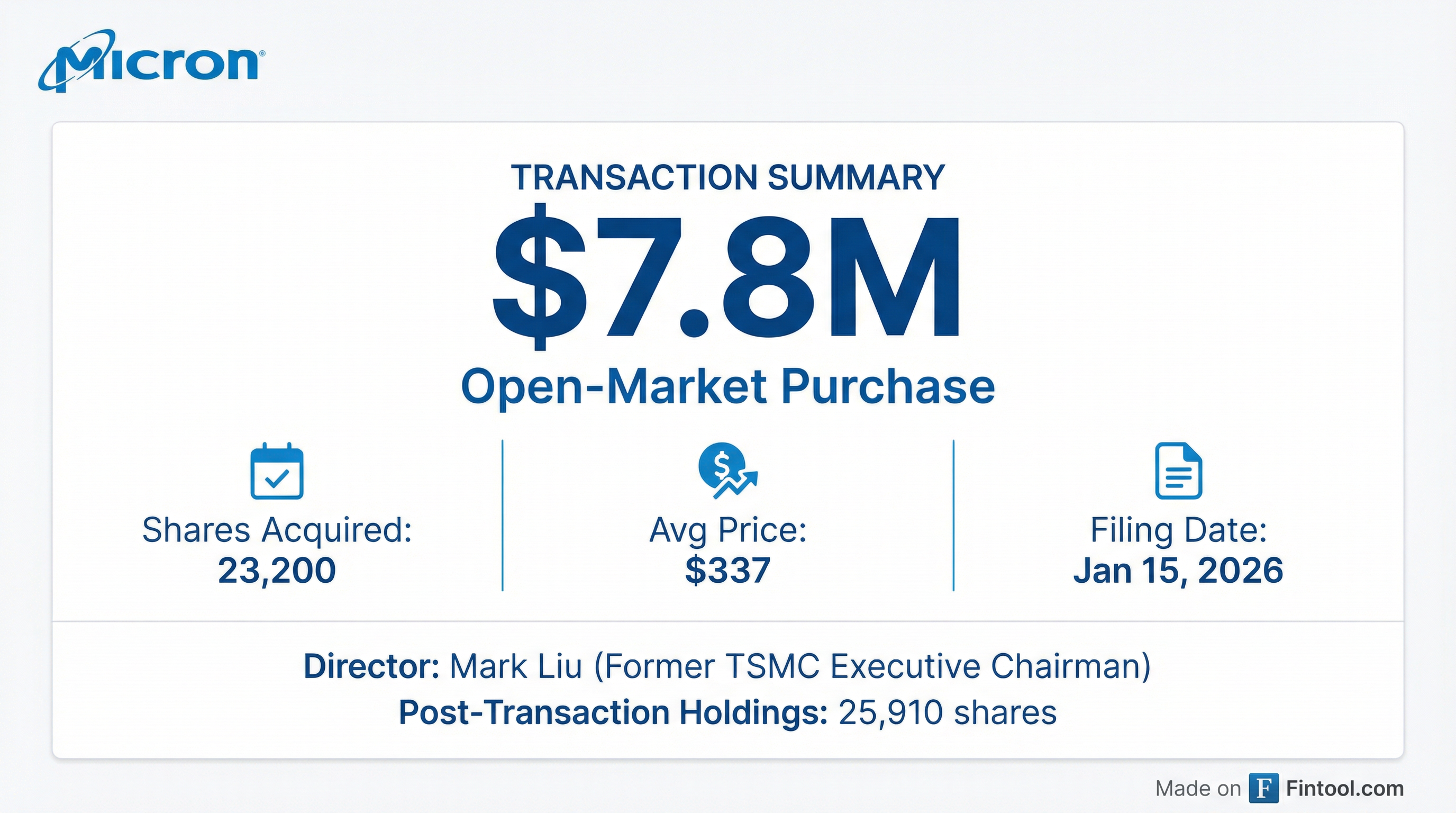The open-market purchases, disclosed in an SEC Form 4 filing on January 15, mark one of the largest director buys in the semiconductor industry this year. Liu acquired 23,200 shares across three transactions on January 13-14 at prices between $336.63 and $337.50—just below Micron's+6.76% all-time high of $351.23 hit on January 13.