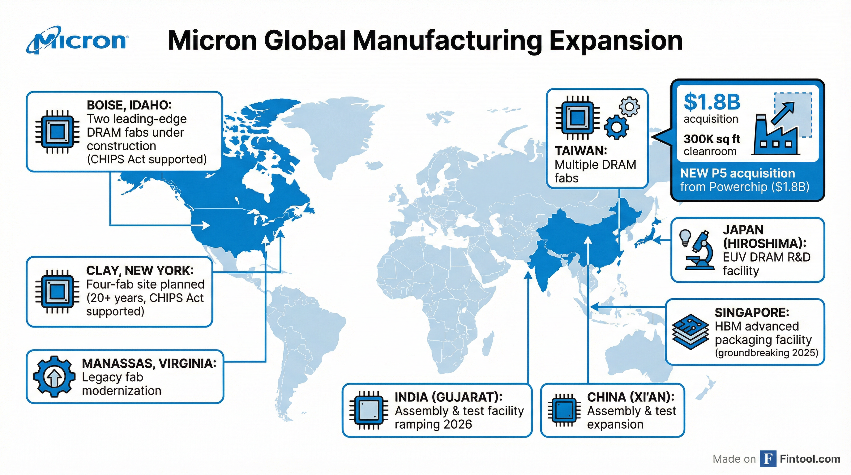 The Taiwan acquisition is about speed to market. While Micron has committed to massive US expansion through the CHIPS Act—up to $200 billion over 20 years across Idaho and New York—those fabs won't contribute meaningful output until 2030 and beyond.