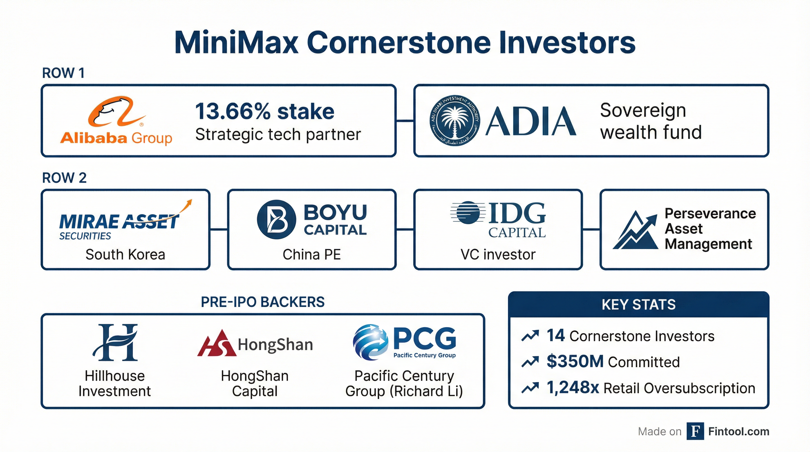 MiniMax attracted a who's who of global institutional capital. Alibaba+10.17% acquired approximately 13.66% of the company, deepening its integration with Alibaba Cloud's AI services. Abu Dhabi Investment Authority provided sovereign wealth backing, while South Korea's Mirae Asset Securities, Boyu Capital, and IDG Capital rounded out the cornerstone investor roster.