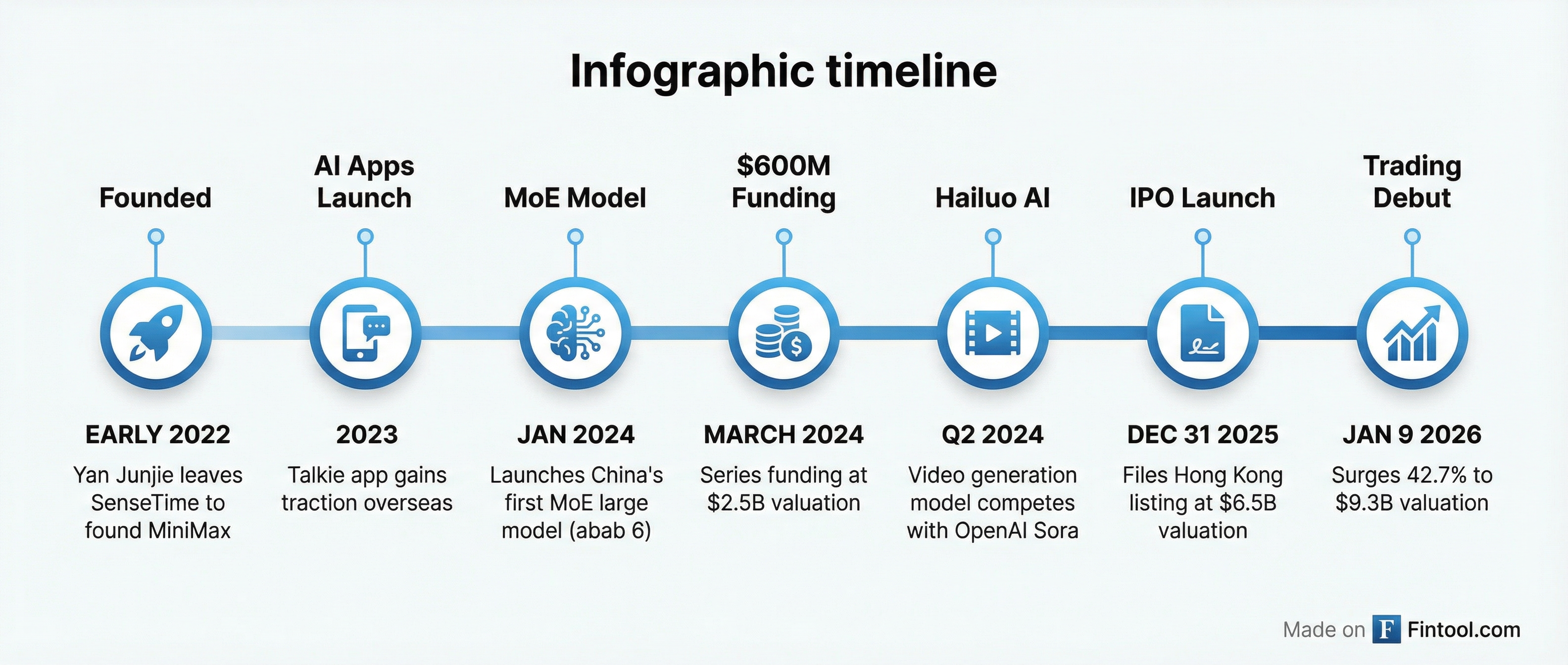 MiniMax's ascent has been rapid. Founded in early 2022 by Yan Junjie, a former senior executive at SenseTime, the company has built a multimodal AI platform capable of generating text, images, audio, video, and music—positioning it as China's most comprehensive answer to OpenAI.