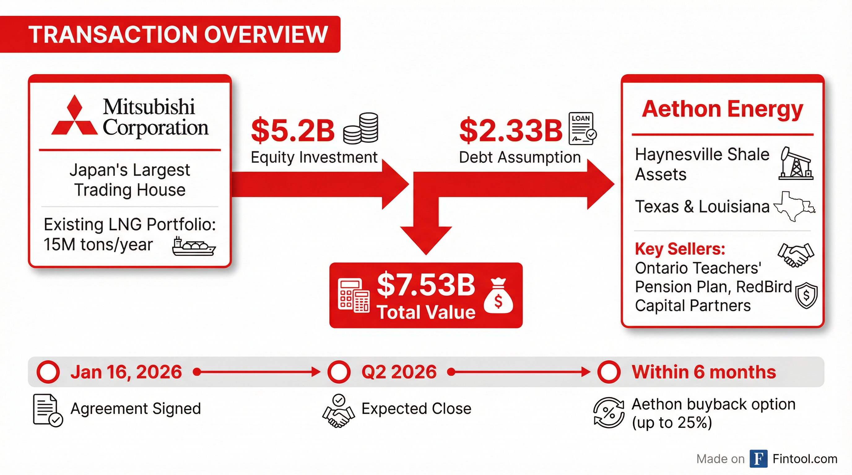 Mitsubishi is investing $5.2 billion to acquire Aethon's equity interests, while assuming approximately $2.33 billion in net debt. The sellers include Ontario Teachers' Pension Plan and RedBird Capital Partners, major private equity backers that built Aethon into one of the Haynesville's dominant players.