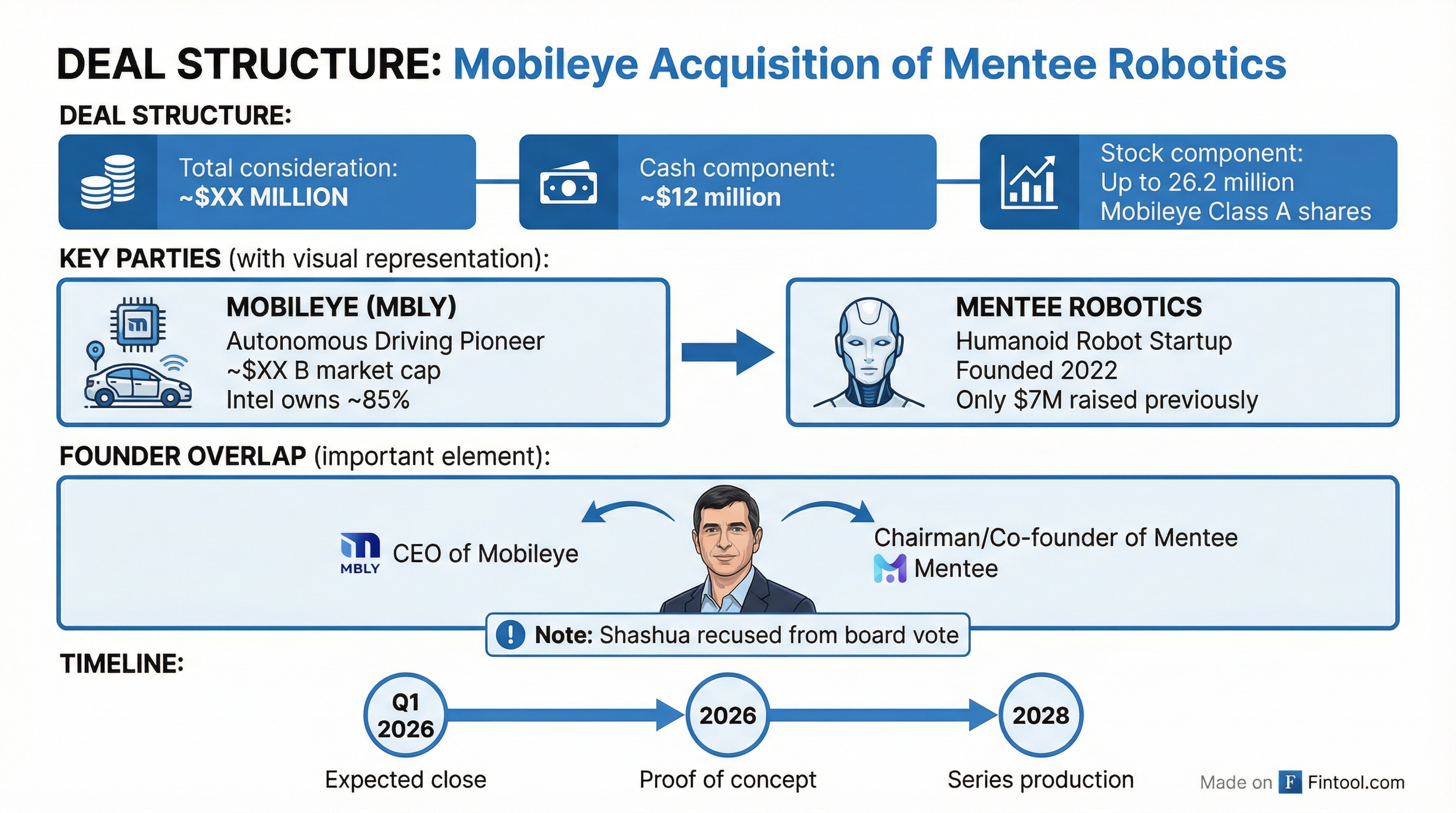 Mobileye-8.17% announced at CES 2026 it will acquire Mentee Robotics, a humanoid robot startup co-founded by Mobileye's own CEO Amnon Shashua, for approximately $900 million in cash and stock—the largest-ever acquisition combining an automotive technology company with humanoid robotics.