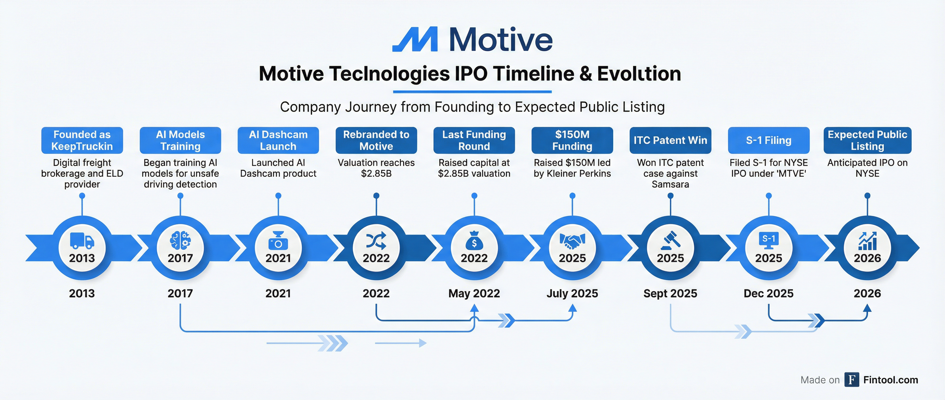 Motive Technologies filed for a New York Stock Exchange listing on Tuesday, revealing $327 million in nine-month revenue and setting the stage for a direct public market battle with rival Samsara-1.45%—the $21 billion fleet management giant it just defeated in a patent infringement case. The S-1 filing positions Motive as one of the first major AI-focused tech IPOs of 2026.