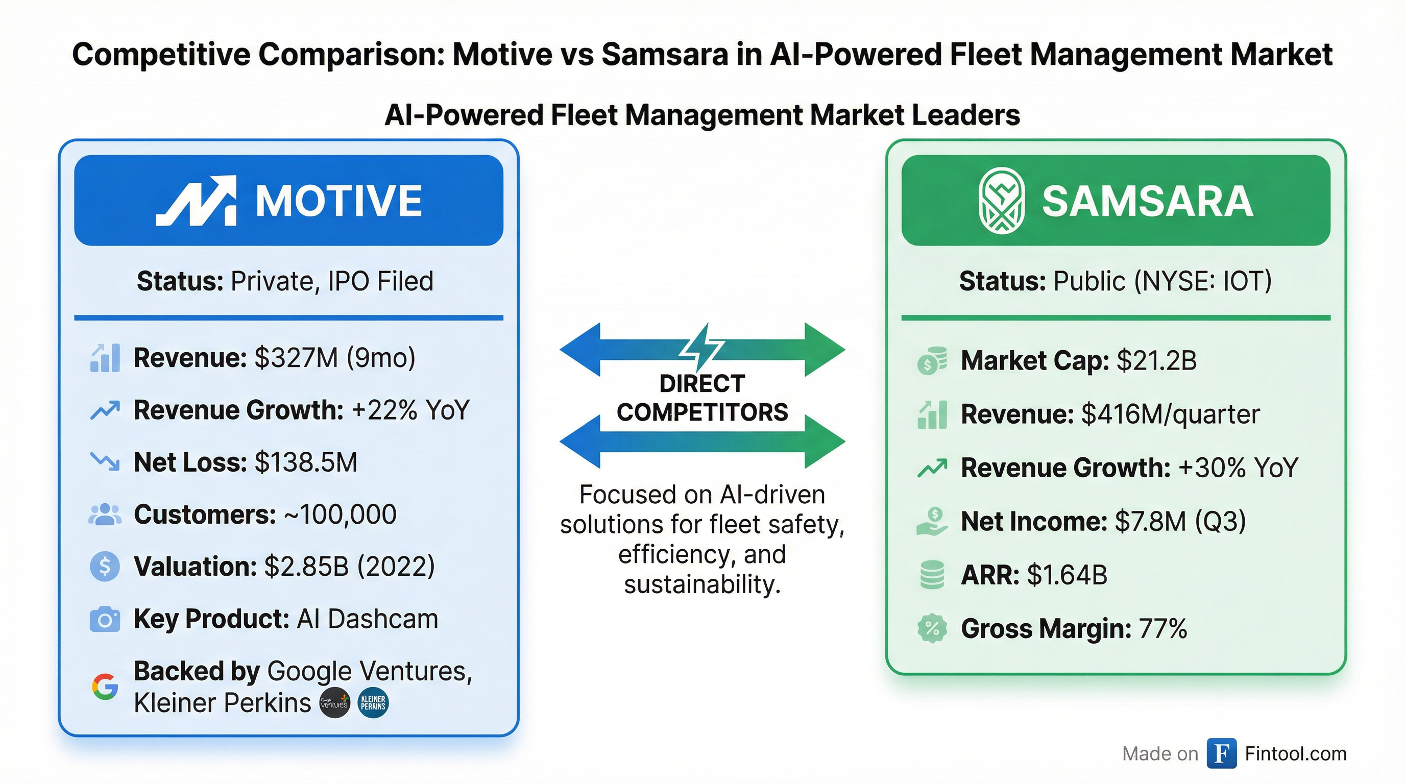 The IPO puts investors in position to directly compare Motive against Samsara, the fleet management leader that went public in December 2021. The valuation gap is instructive: