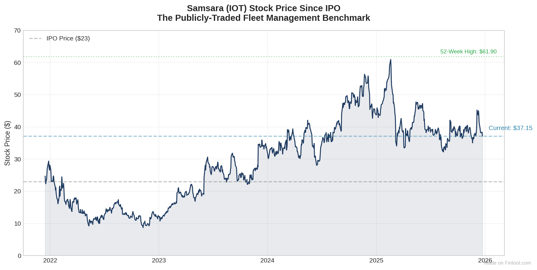 Samsara's stock has gained 61% from its $23 IPO price but sits 40% below its 52-week high of $61.90—a reflection of the broader tech selloff and AI stock volatility that plagued late 2025.