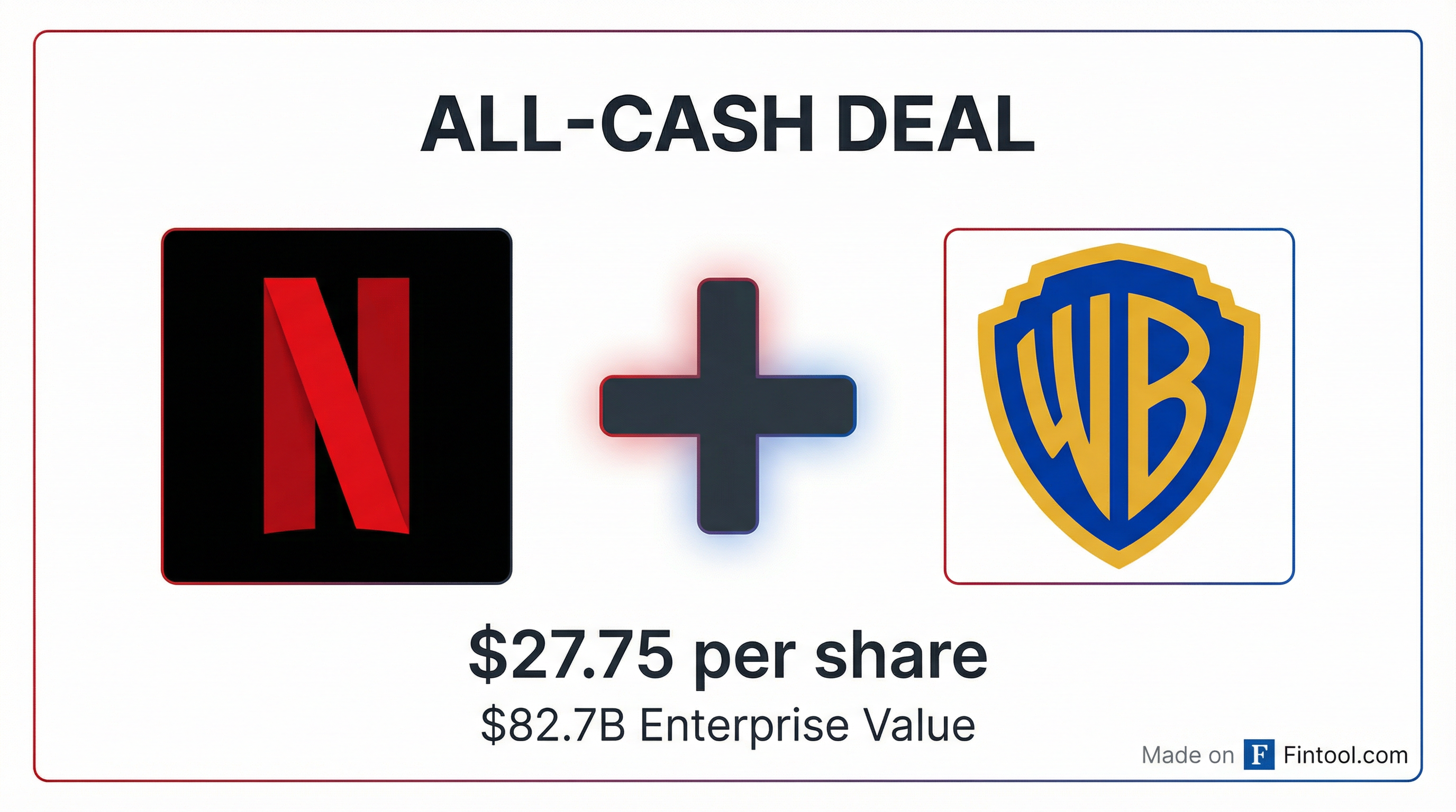 Netflix's original December offer included $23.25 in cash plus $4.50 in Netflix stock, subject to a price collar of $97.91 to $119.67 per share. With Netflix shares trading at just $88—well below the collar floor—WBD shareholders faced uncertainty about the deal's ultimate value.