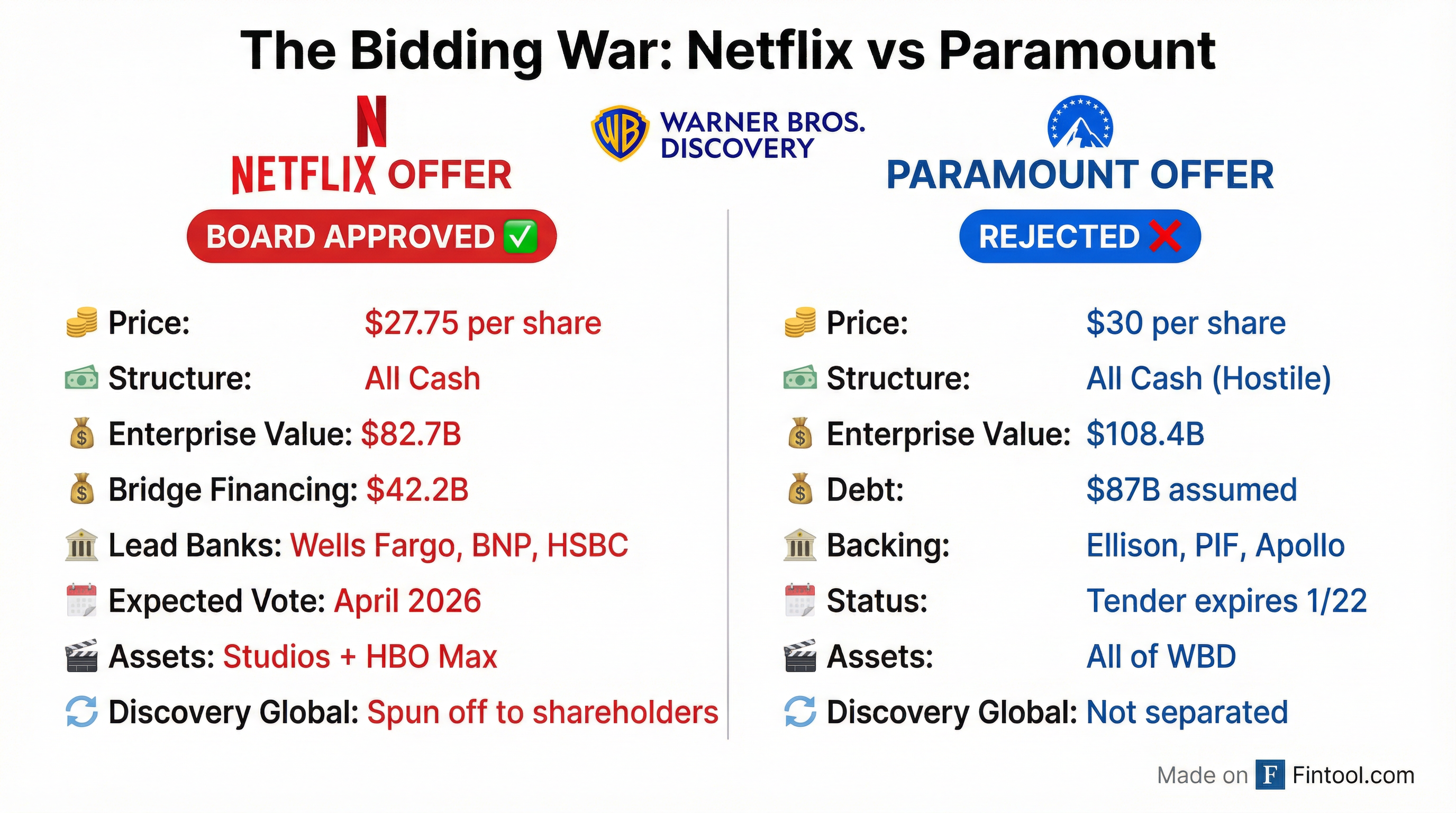 Paramount's offer of $30 per share—a 139% premium to WBD's undisturbed stock price—appeared more generous on paper. But the WBD board rejected it twice, calling it "inadequate" and characterizing it as a highly leveraged buyout that posed significant execution risks.
