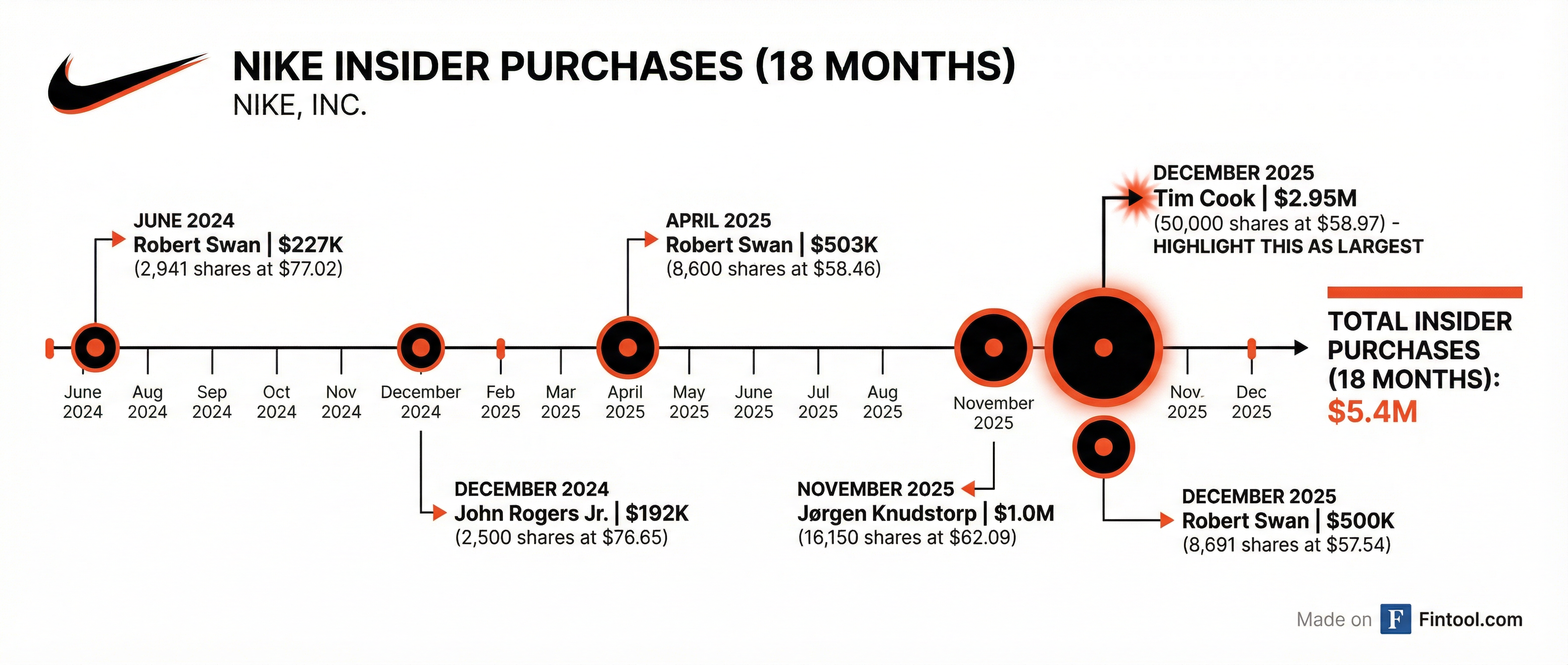 The timing is notable: Cook has been on Nike's board since 2005 and rarely makes open-market purchases. This marks his largest Nike buy in recent years—a meaningful signal from a CEO known for disciplined capital allocation.