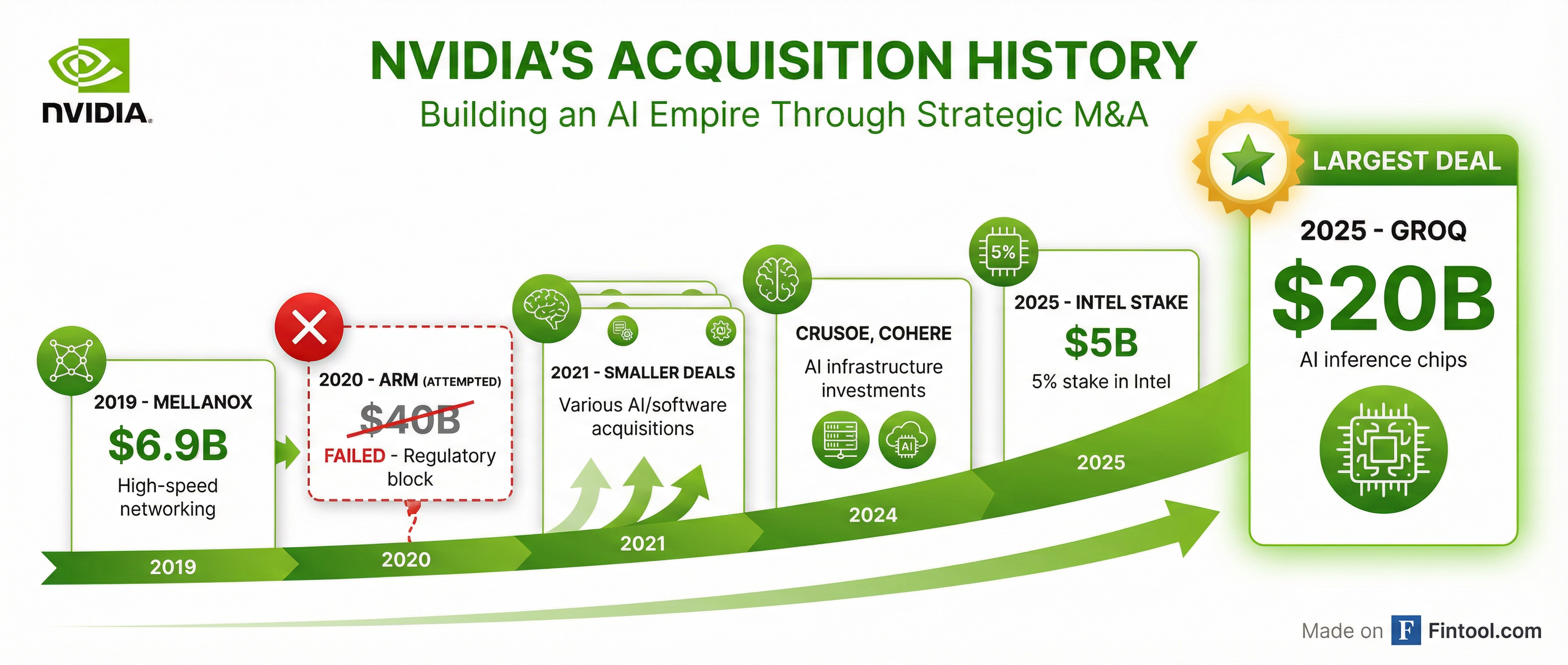 NVIDIA's recent $5 billion Intel investment—which received FTC clearance just days ago—suggests the regulatory environment has thawed somewhat for NVIDIA deals that don't raise obvious competitive concerns.