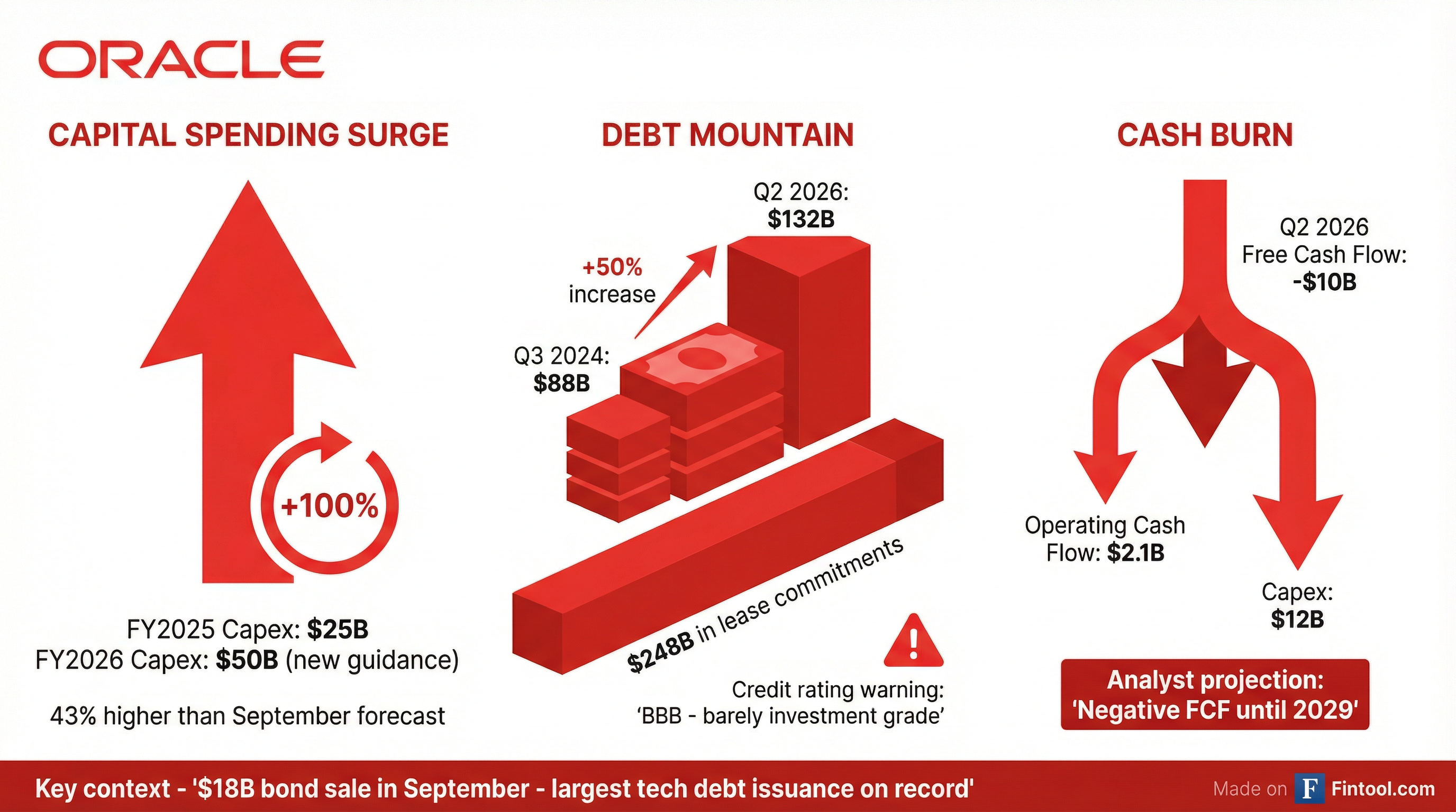 In September, Oracle raised $18 billion in a jumbo bond sale—one of the largest debt issuances in tech industry history. Total debt has ballooned to $132 billion from $88 billion two years ago, and the company has committed to $248 billion in lease obligations to boost cloud capacity.