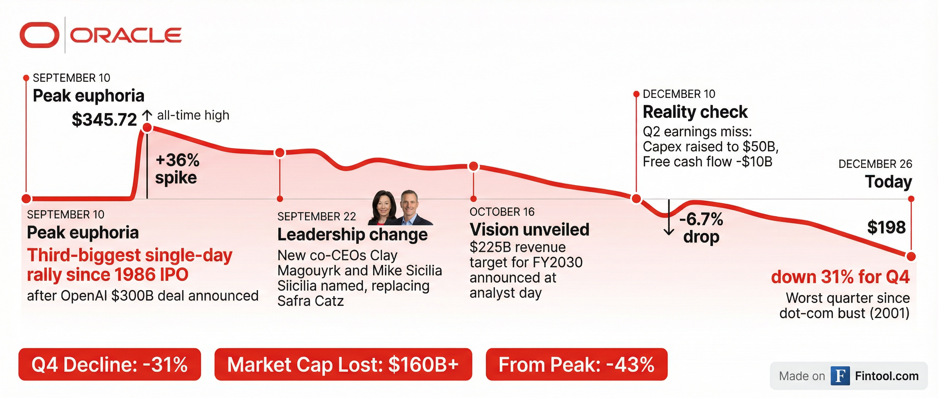 What began as Silicon Valley's biggest cloud deal ever has become a cautionary tale about the perils of AI infrastructure bets. Oracle's $300 billion OpenAI partnership, announced to great fanfare in September, initially sent shares rocketing 36%—the third-largest single-day rally in the company's history since its 1986 IPO. By the close of that day, the stock hit an intraday record of $345.72.