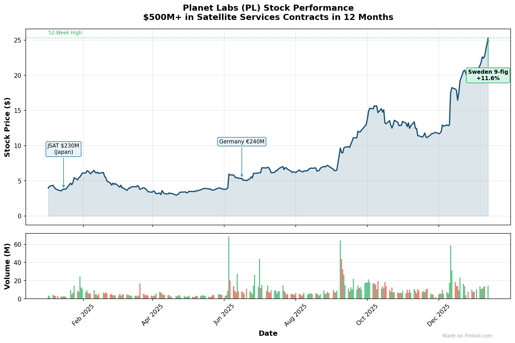 Planet Labs+12.02% stock surged 11.6% to $25.36 on Monday after the satellite imagery company announced its third major government satellite services contract in twelve months—a multi-year, low 9-figure deal with the Swedish Armed Forces.