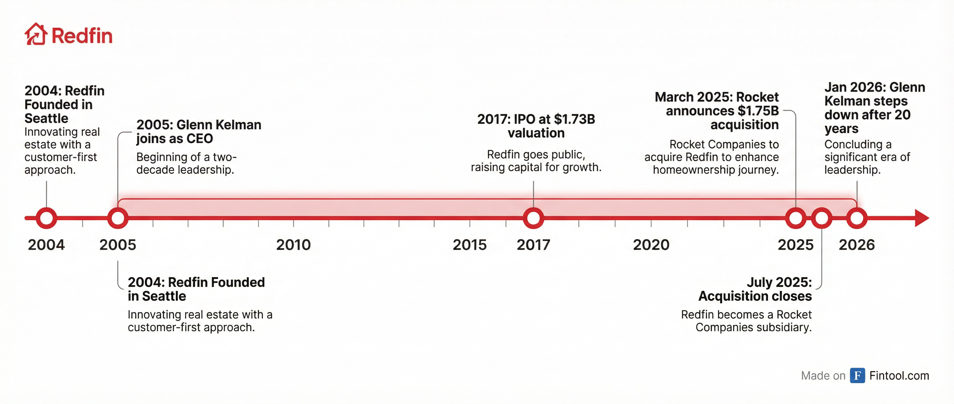Glenn Kelman, the outspoken leader who transformed Redfin from a three-person startup into a tech-enabled real estate giant, announced Tuesday that he is stepping down as CEO after 20 years. The departure comes just six months after Rocket Companies-1.81% completed its $1.75 billion acquisition of the Seattle-based brokerage, marking the end of an era in real estate technology.