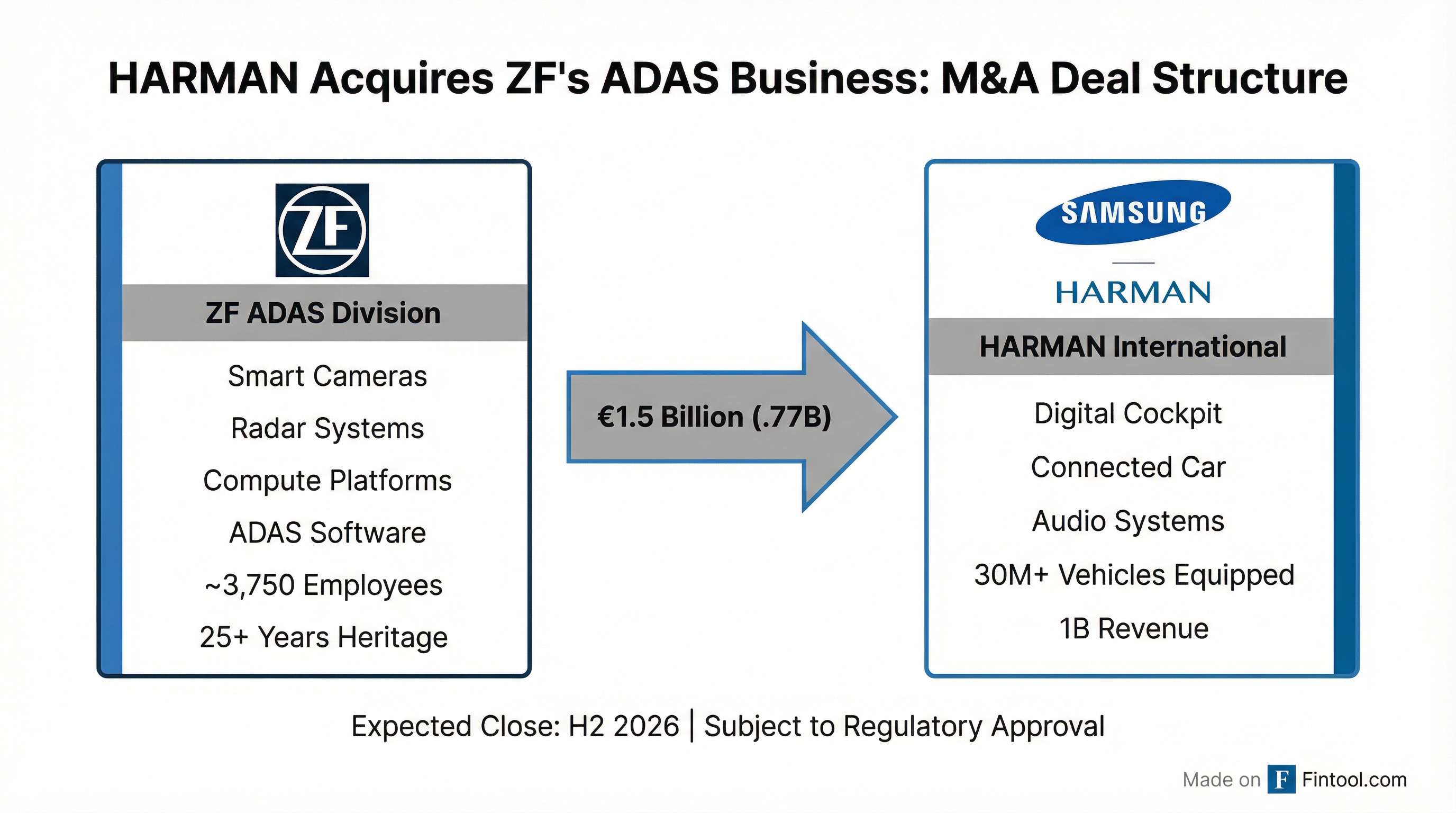 Regulatory scrutiny: Closing is expected in H2 2026, subject to approvals. Given the deal's size and Samsung's existing automotive presence, antitrust review in Europe and elsewhere is likely.