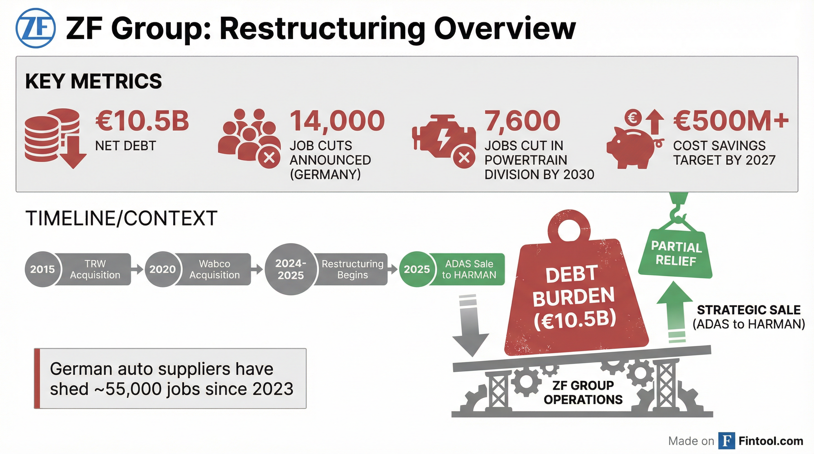 The ZF-HARMAN transaction is the latest marker of distress in Germany's automotive supply chain. The industry has shed approximately 55,000 jobs since 2023, according to the German automotive association VDA, with suppliers bearing the brunt of the cuts.