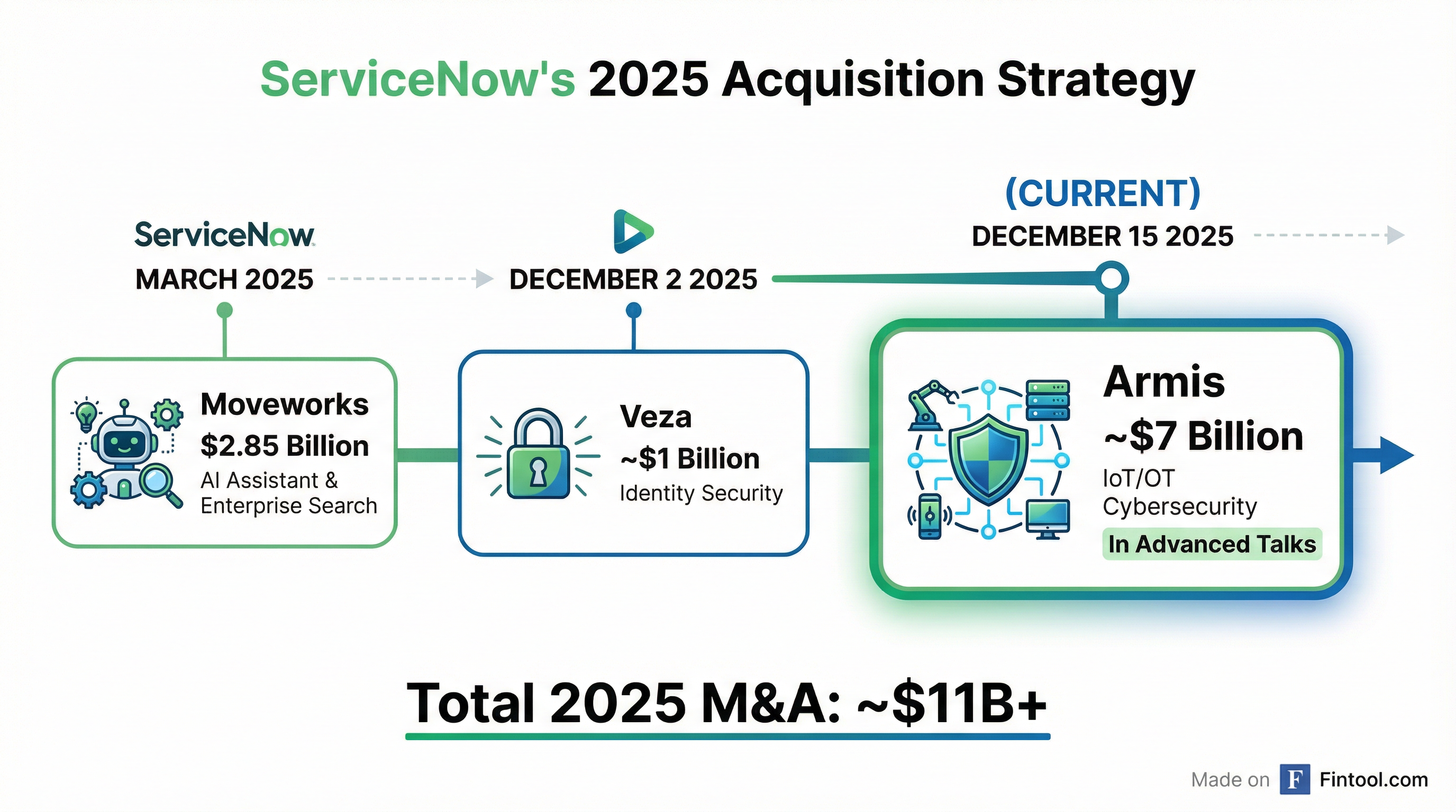 If the Armis deal closes at the reported price, ServiceNow will have committed more than $11 billion to M&A in 2025 alone—a dramatic shift for a company that historically relied on organic product development.