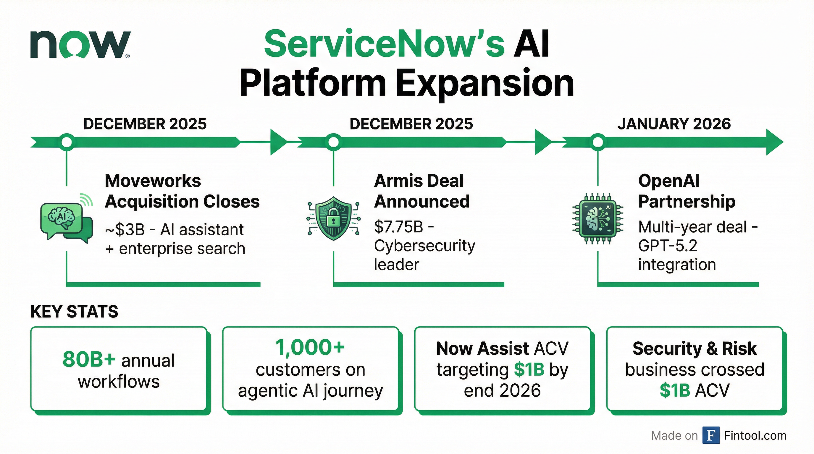 - Armis acquisition ($7.75B cash) announced December 23, 2025—a cybersecurity firm that will extend ServiceNow's security capabilities across IT, OT, and medical devices