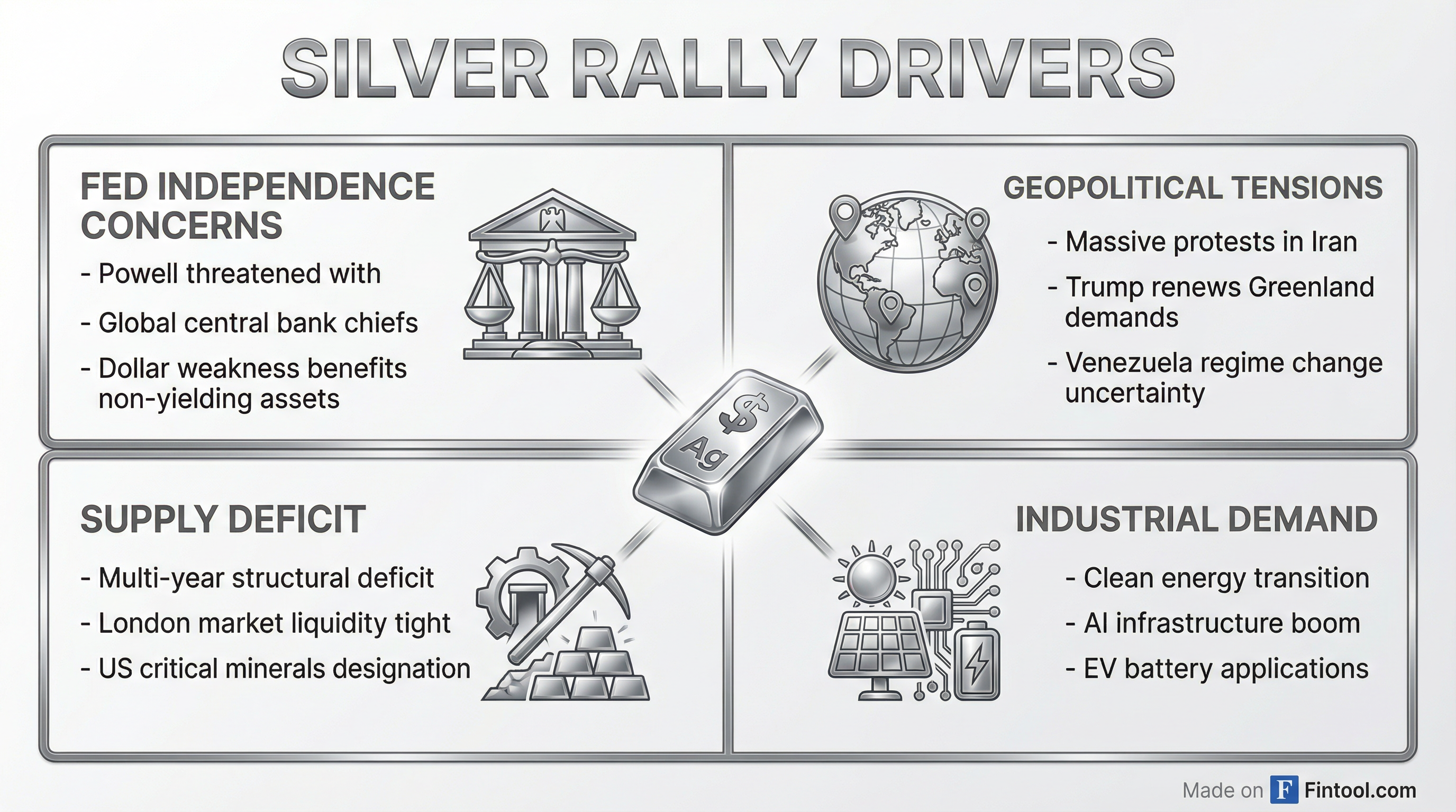 Section 232 investigation: Results could lead to U.S. tariffs on silver, platinum, and palladium, potentially accelerating the supply crunch.