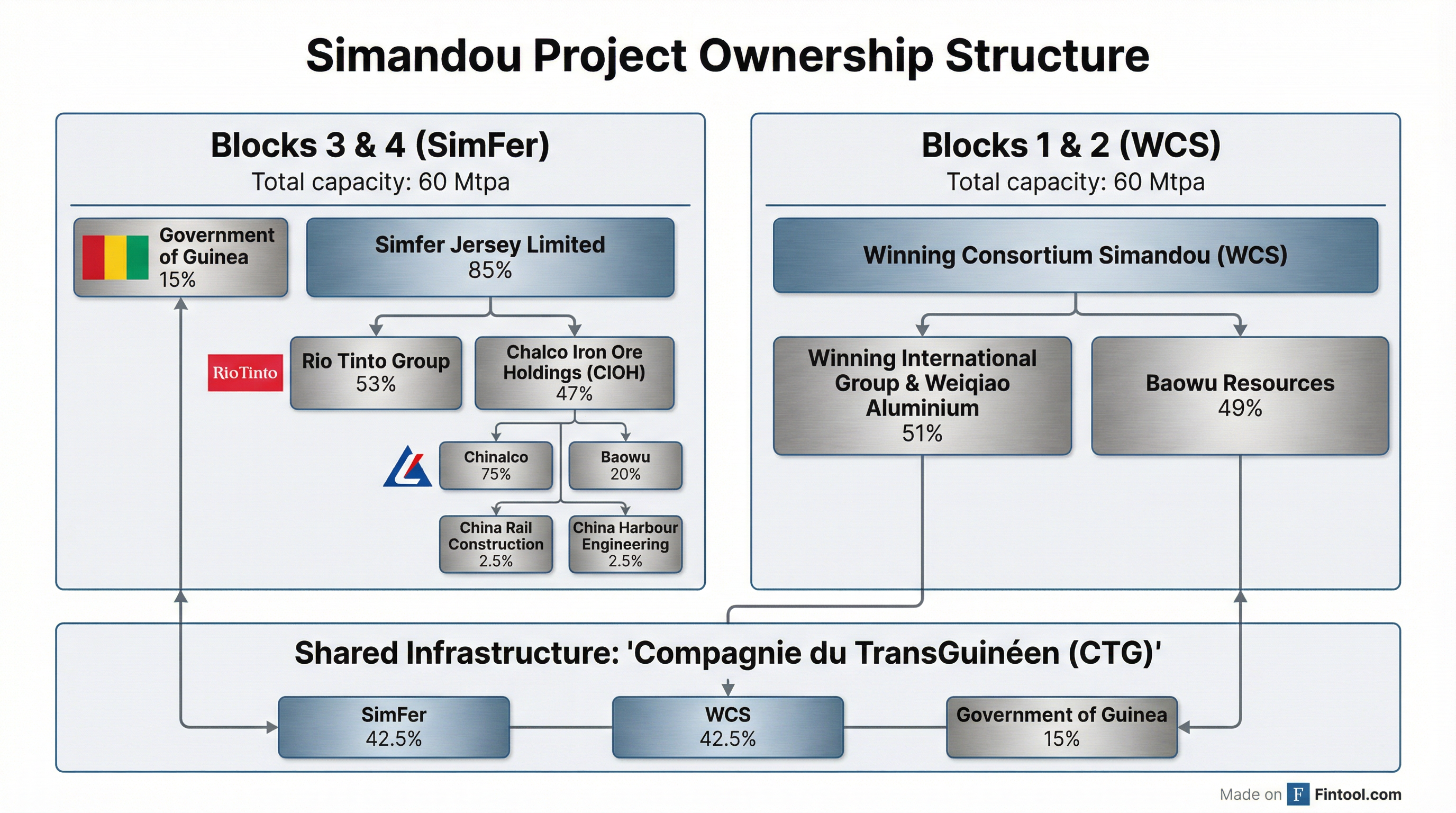 Blocks 3 & 4 are held by the SimFer joint venture, in which Rio Tinto effectively controls 45% through its 53% stake in Simfer Jersey Limited. Chalco Iron Ore Holdings—a Chinalco-led consortium including Baowu (20%), China Rail Construction (2.5%), and China Harbour Engineering (2.5%)—holds the remaining 47% of Simfer Jersey. Guinea's government retains a 15% direct stake .